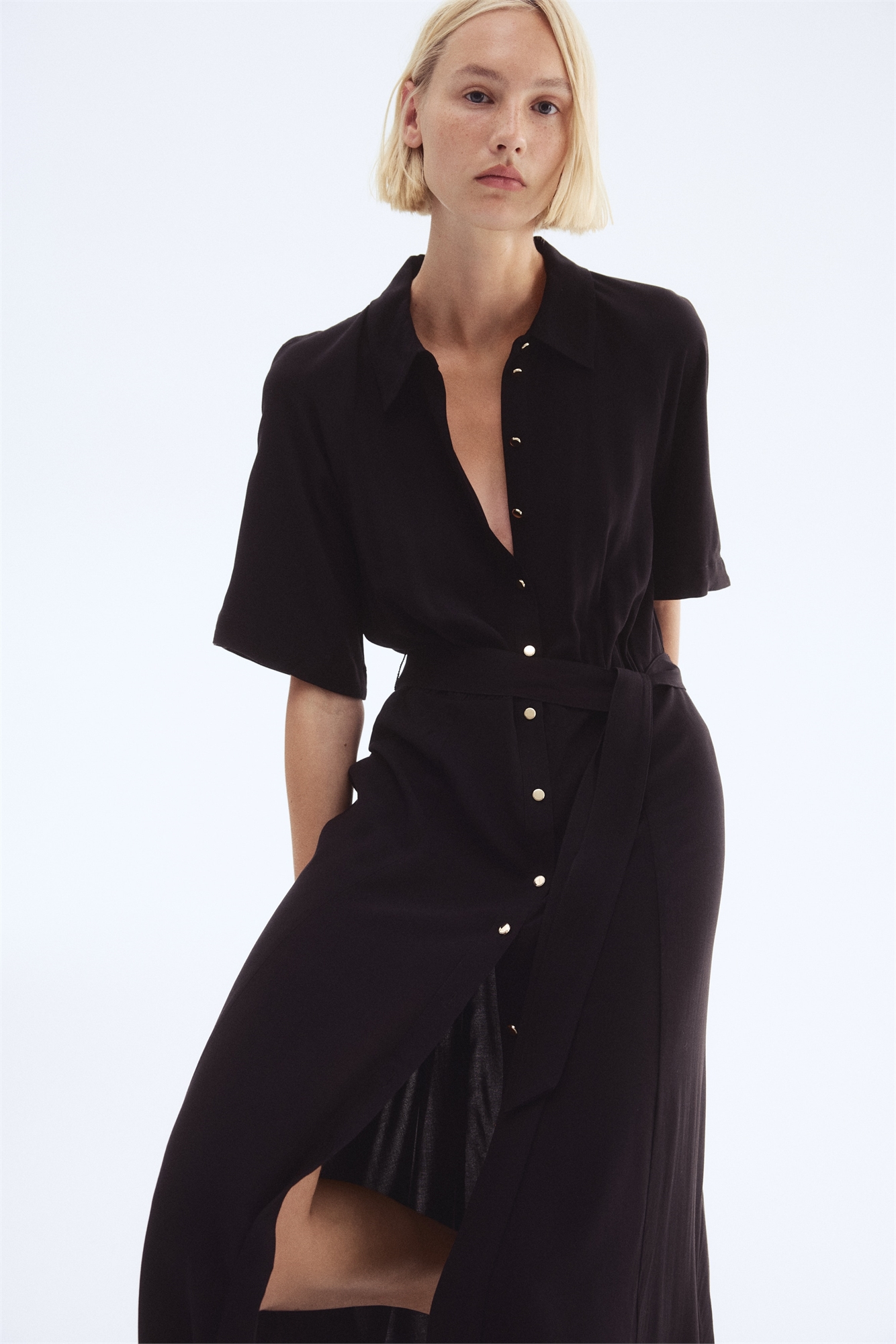 Платье-рубашка длиной до колен из тканого материала с воротником, пуговицами спереди и короткими рукавами реглан. На талии узкая эластичная резинка, сборки спереди и сзади и съемный пояс с завязками.
