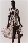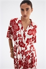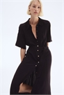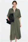 Платье-рубашка длиной до колен из тканого материала с воротником, пуговицами спереди и короткими рукавами реглан. На талии узкая эластичная резинка, сборки спереди и сзади и съемный пояс с завязками.