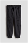 Джоггеры-карго из тканого материала с ребристой, эластичной, утягивающей талией и фальшивой ширинкой. Боковые карманы, фальшивые накладные карманы сзади и карманы на ногах с клапаном. Зауженные ножки с ребристыми каймами.
