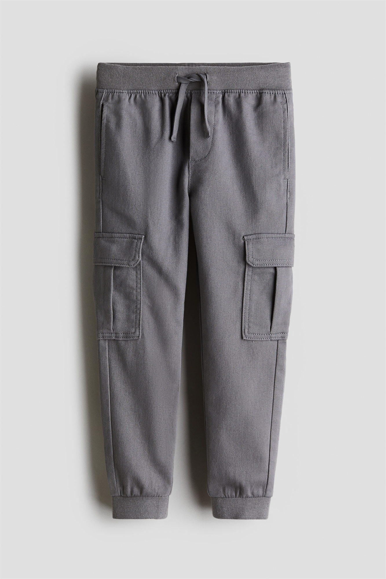 Джоггеры-карго из тканого материала с ребристой, эластичной, утягивающей талией и фальшивой ширинкой. Боковые карманы, фальшивые накладные карманы сзади и карманы на ногах с клапаном. Зауженные ножки с ребристыми каймами.
