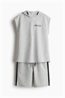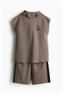 Спортивный комплект с толстовкой и шортами из мягкого трикотажа. Толстовка с капюшоном на сетчатой подкладке с декоративным шнурком, рукавами реглан и аккуратным закругленным подолом. Шорты с эластичной утягивающейся талией, незаметными боковыми карманами и вентиляционной сетчатой панелью на каждой стороне.