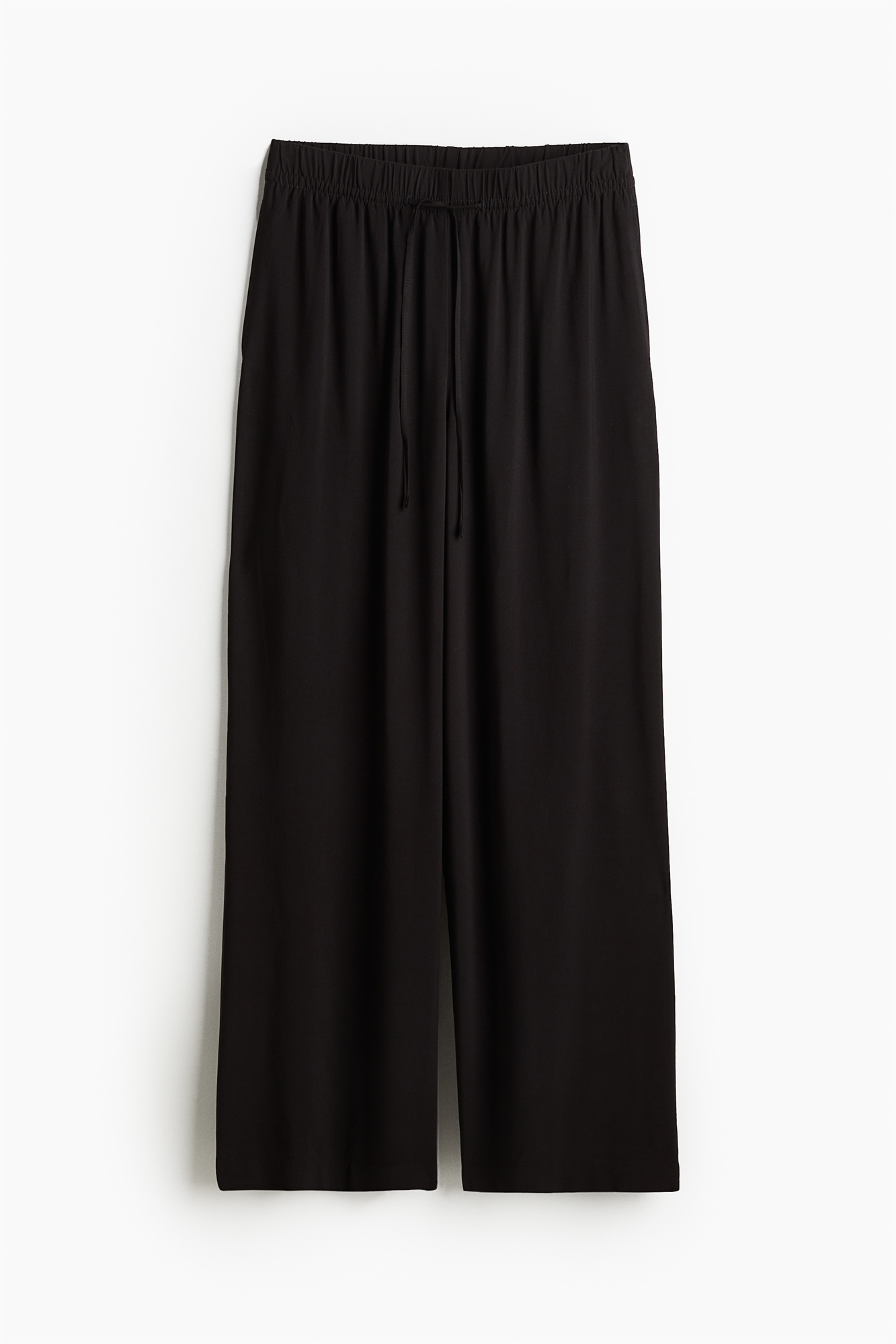 Брюки из тонкой и легкой вискозы, с высокой талией, эластичной поясом и узким шнурком. Свободный крой с незаметными карманами в боковых швах и широкие прямые штанины.