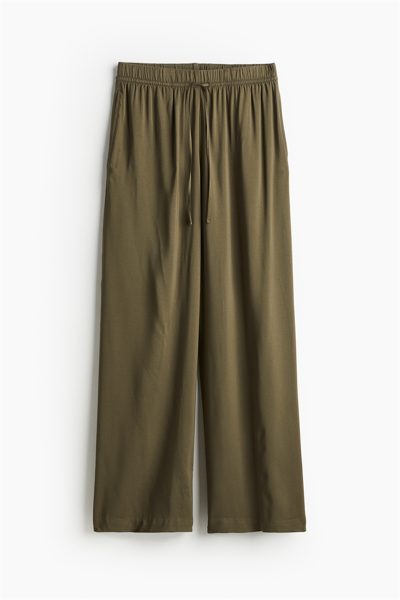 Брюки из тонкой и легкой вискозы, с высокой талией, эластичной поясом и узким шнурком. Свободный крой с незаметными карманами в боковых швах и широкие прямые штанины.
