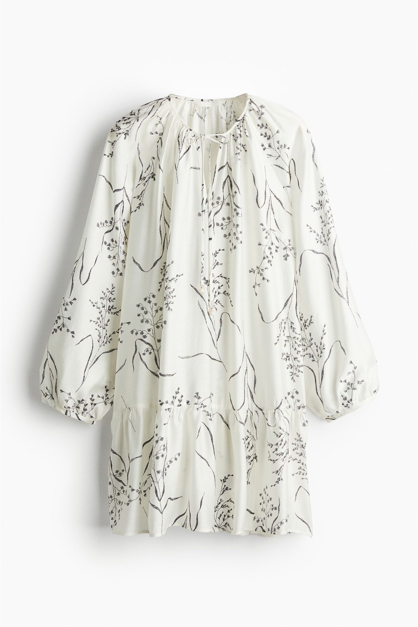 Короткое платье свободного покроя из тканого материала с круглым вырезом и V-образной проймой с завязками-спагетти спереди. Длинные рукава реглан-баллон с узкой окантовкой и пуговицей на манжетах. Сборки по вырезу горловины и сборчатый шов над подолом для придания дополнительного объема. Без подкладки.