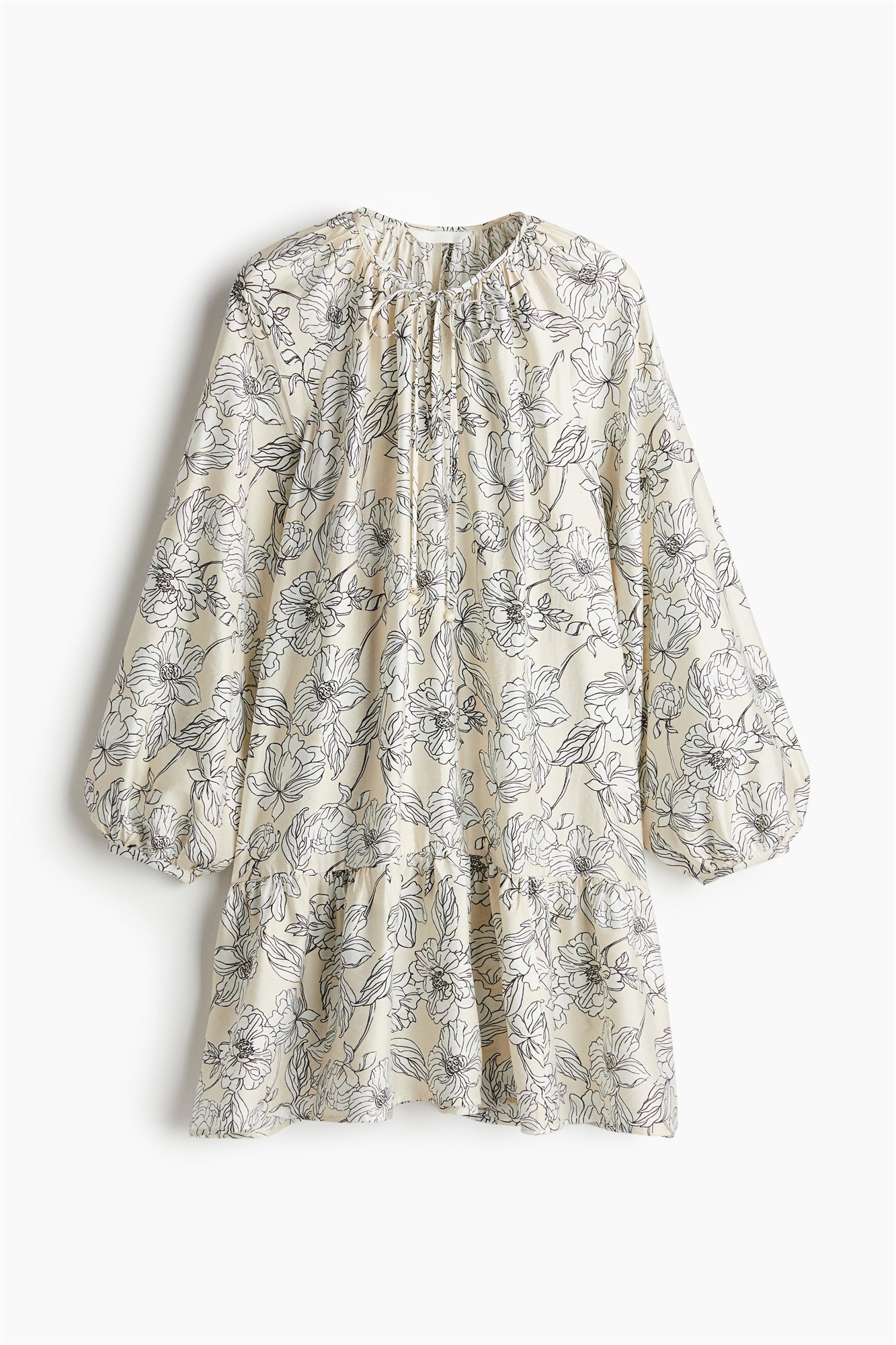 Короткое платье свободного покроя из тканого материала с круглым вырезом и V-образной проймой с завязками-спагетти спереди. Длинные рукава реглан-баллон с узкой окантовкой и пуговицей на манжетах. Сборки по вырезу горловины и сборчатый шов над подолом для придания дополнительного объема. Без подкладки.