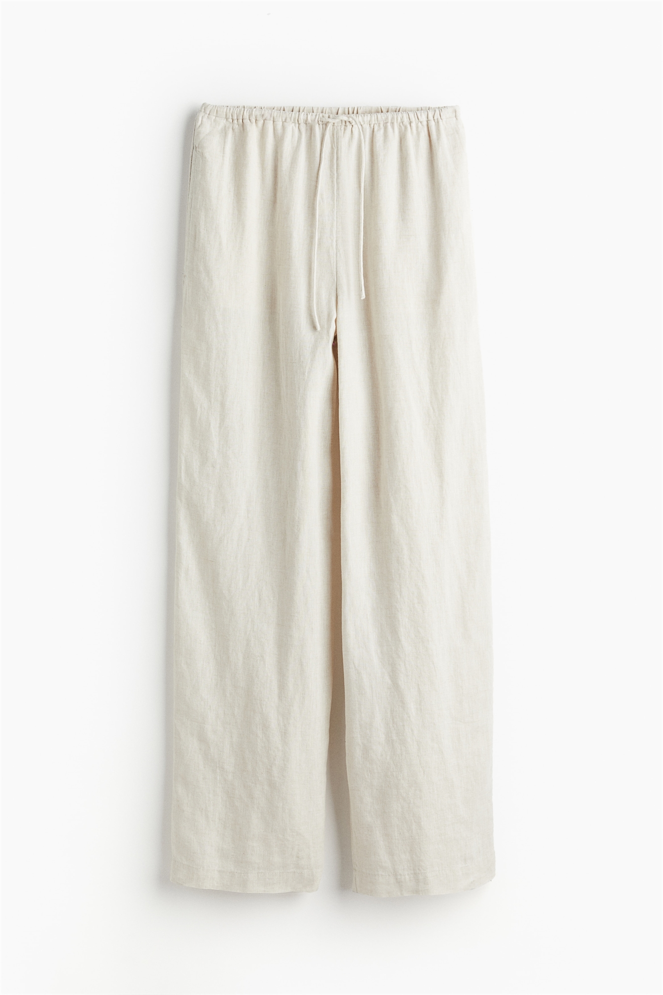 Свободные брюки из воздушного льна с высокой эластичной талией с узким шнурком, неброскими боковыми карманами и широкими ногами.