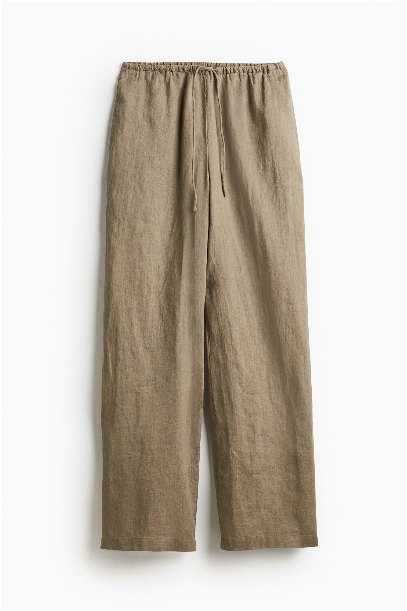 Свободные брюки из воздушного льна с высокой эластичной талией с узким шнурком, неброскими боковыми карманами и широкими ногами.