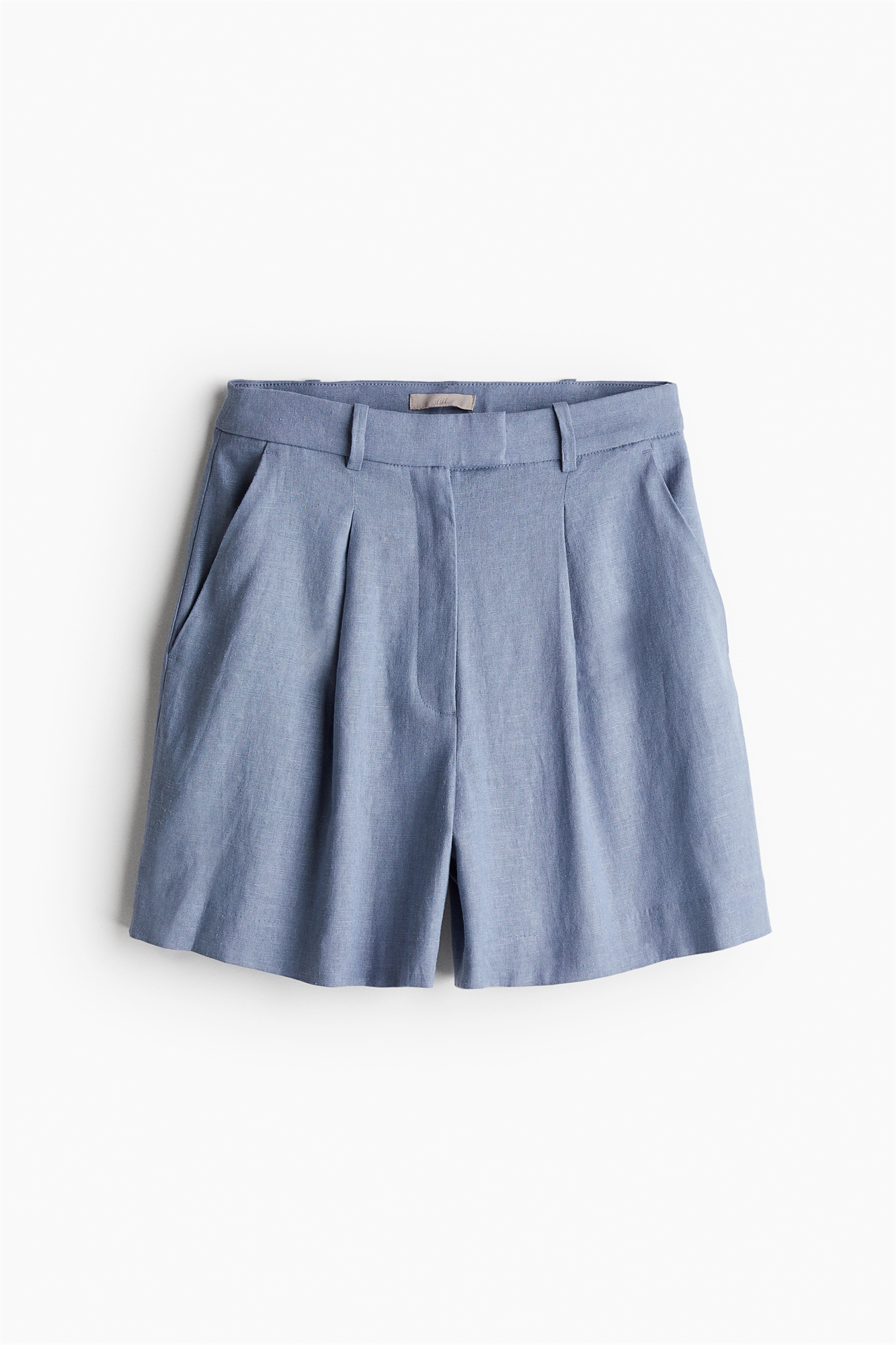 Шорты свободного кроя с воздушным плетением из смеси льна и вискозы. Высокая талия, ширинка на молнии и удлиненный пояс со скрытой застежкой на пуговицу и крючок с ушком. Диагональные боковые карманы, втачные карманы сзади и ножки со складками в верхней части.