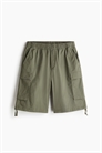 Шорты длиной до колена из хлопковой саржи с эластичной отделкой, скрытым шнурком на талии и фальшивой ширинкой. Диагональные боковые карманы и накладные ножные и задние карманы с застежками-крючками. Скрытая завязка на подоле. Свободный крой для пышного, но не чрезмерно большого силуэта.