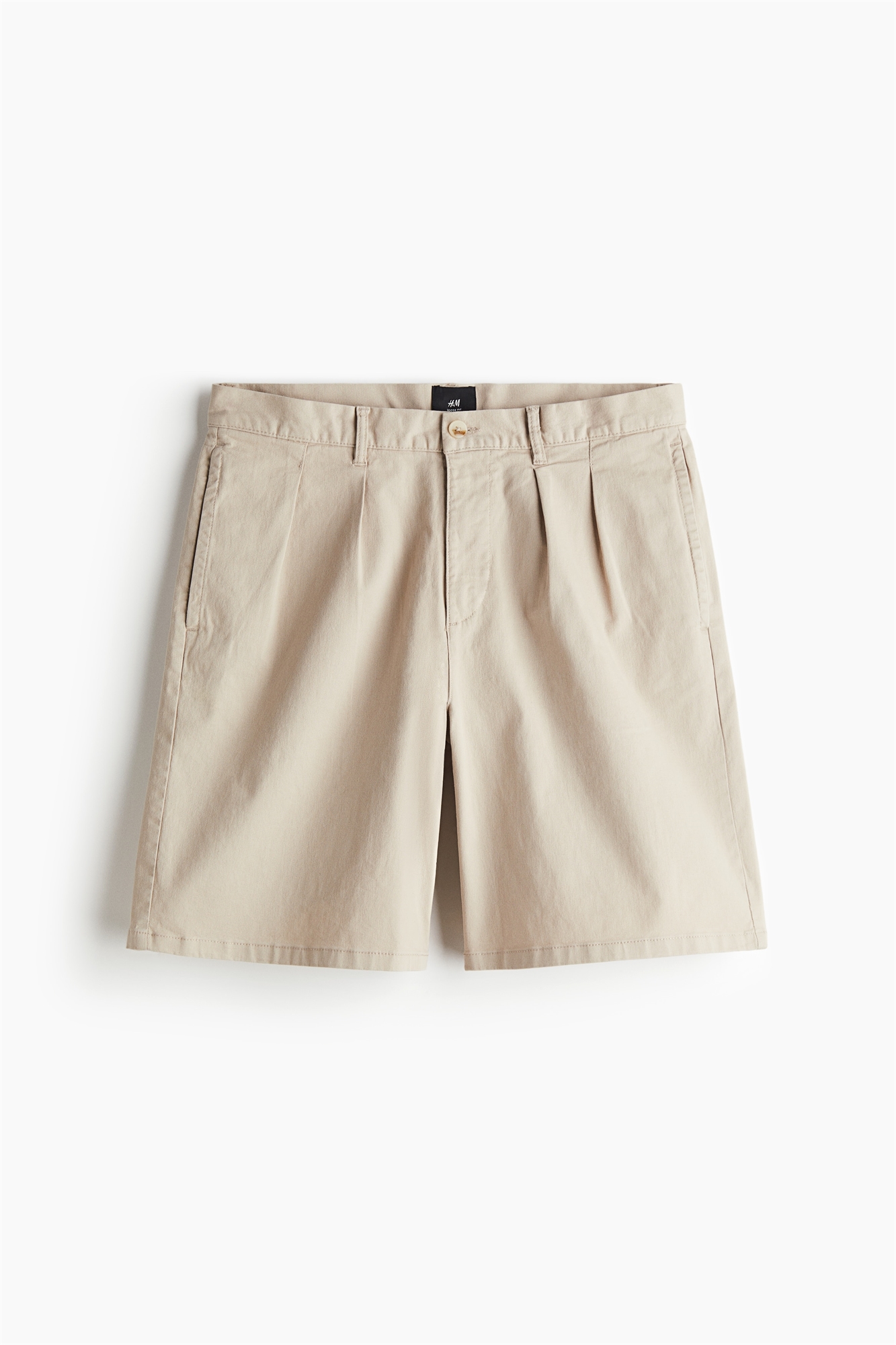 Шорты-чинос из мягкой хлопковой саржи со складками спереди, ширинка на молнии и пуговице, боковые карманы и задние карманы с пуговицей. Свободный крой для пышного, но не чрезмерно большого силуэта.