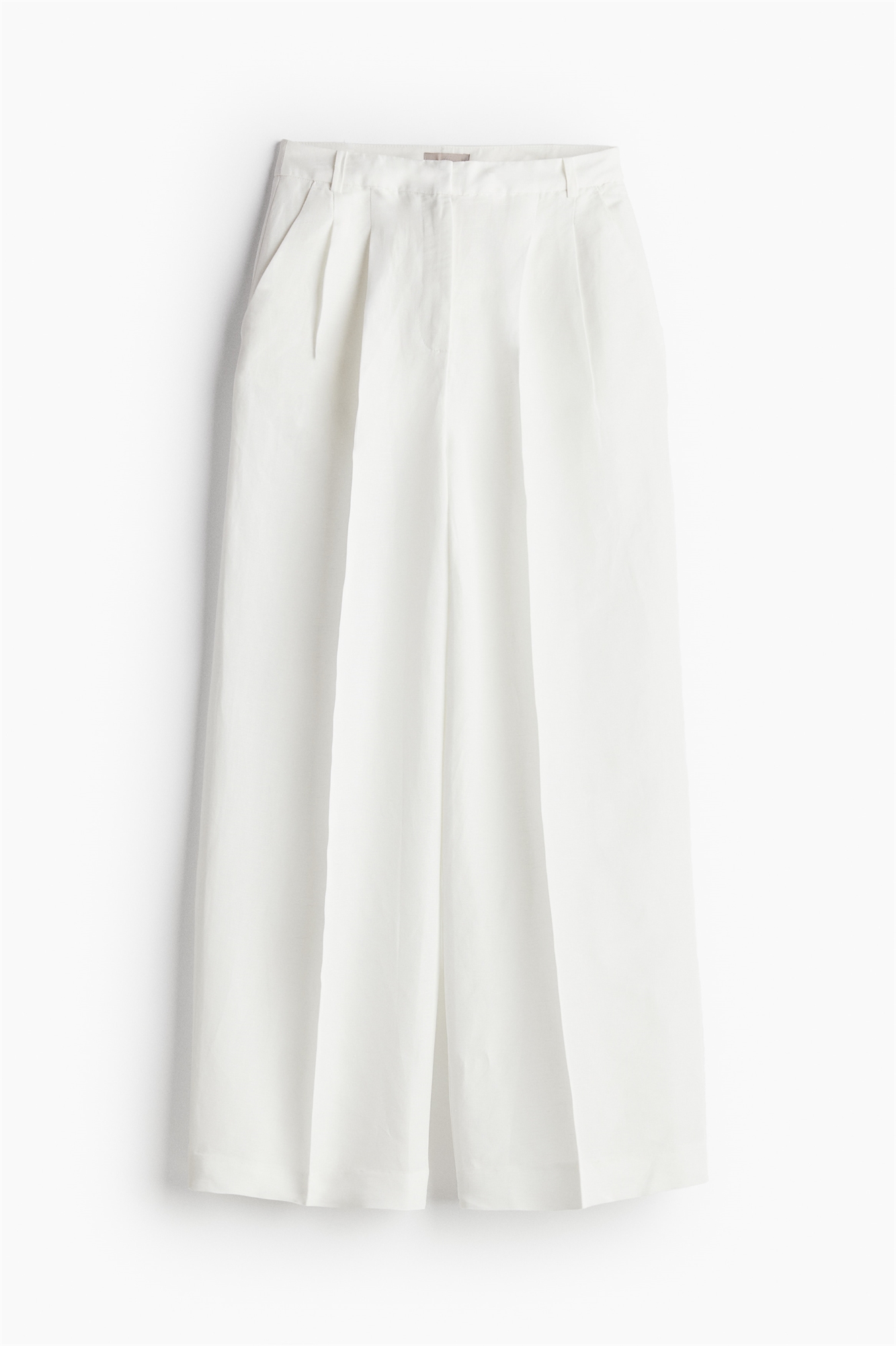 Приталенные брюки из льна и вискозы с высокой талией, ширинкой на молнии, потайной застежкой на пуговицу и крючок, диагональными боковыми карманами и фальшивыми карманами сзади. Свободный крой со складками спереди и широкие ноги со складками спереди и сзади.