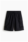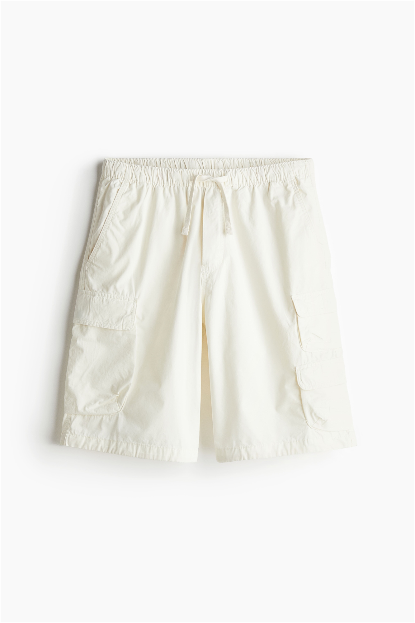Шорты длиной до колена из хлопкового полотна с эластичной, утягивающей талией и фальшивой ширинкой. Боковые карманы, накладные задние карманы с клапаном и три ножных кармана разных размеров с клапаном и кнопкой. Свободный крой для пышного, но не чрезмерно большого силуэта.