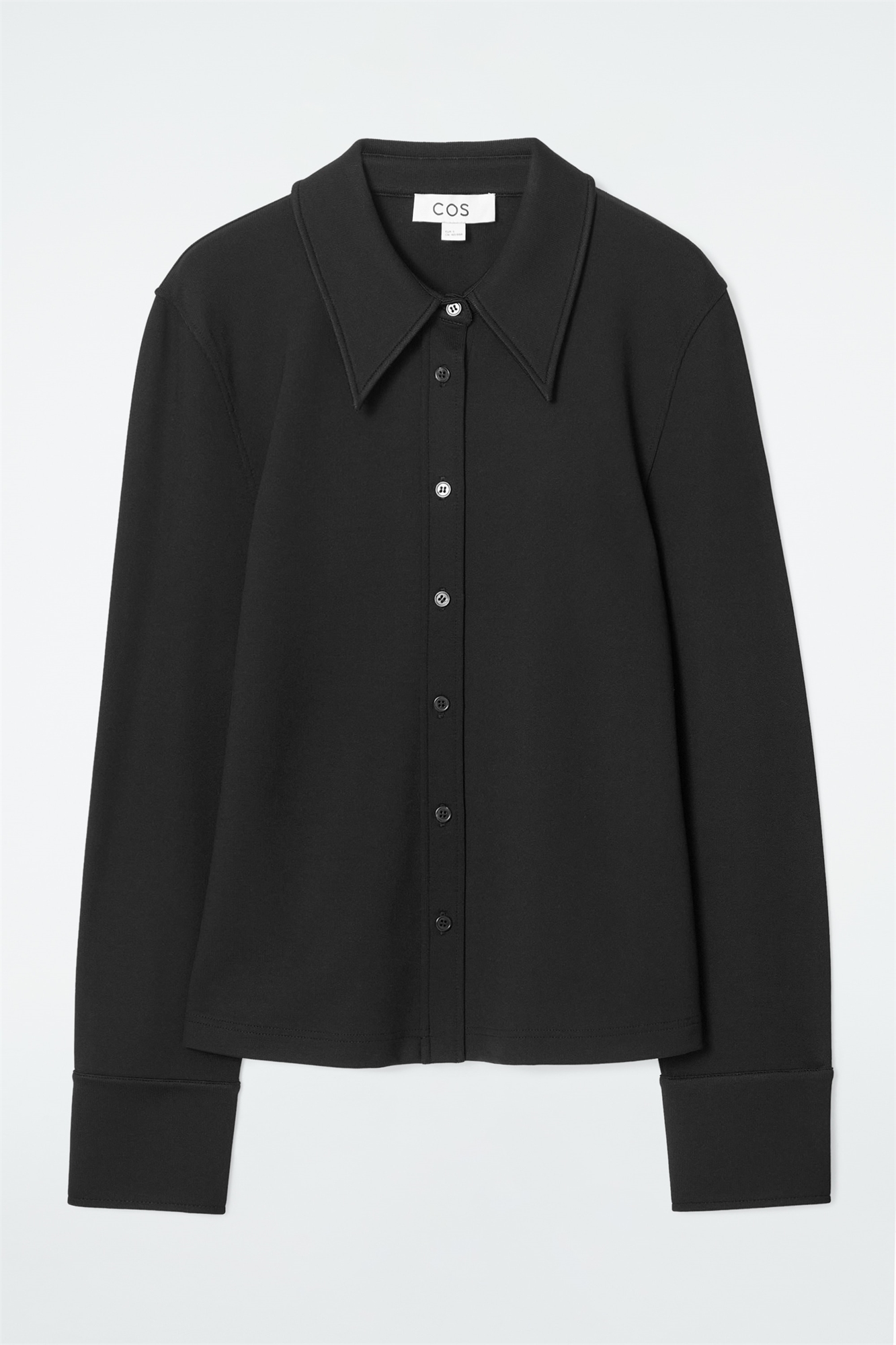 В этом сезоне команда женской одежды COS переосмыслила сарториальные коды 70-х годов для современного гардероба. Эта черная рубашка облегающего силуэта сшита из мягкого джерси вместо классического поплина, имеет завышенный воротник и тональные пуговицы на петлицах и манжетах. Носите ее с соответствующими джоггерами, чтобы по-новому взглянуть на пошив одежды. Зауженный крой Застежка на пуговицы Прямой подол Материал: 61% вискоза, 34% полиамид (нейлон), 5% эластан. Без учета отделки / Машинная стирка Длина по спинке для размера S составляет 60,7 см / Модель носит размер S