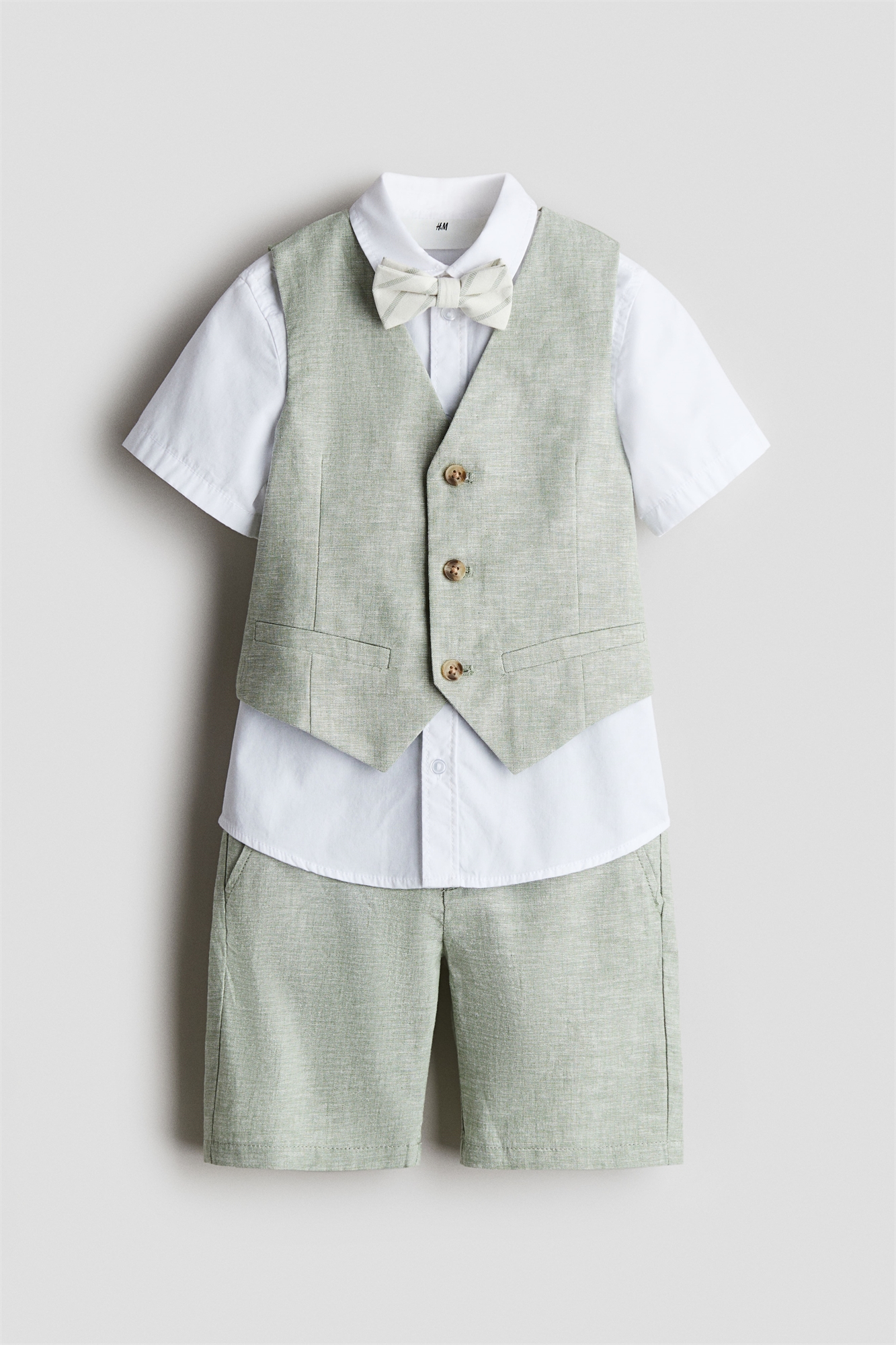 Комплект состоит из рубашки из хлопкового поплина, галстука-бабочки, жилета и пары шорт из воздушного льняного и хлопкового полотна. Рубашка с отложным воротником, застежкой на пуговицы спереди и короткими рукавами. Галстук-бабочка с регулируемым эластичным ремешком и пластиковой застежкой сзади. Жилет на подкладке с пуговицами и втачными карманами спереди. Шорты длиной до колена с регулируемой эластичной резинкой на талии, фальшивой ширинкой и пуговицей, незаметными карманами в боковых швах и фальшивым накладным карманом сзади.