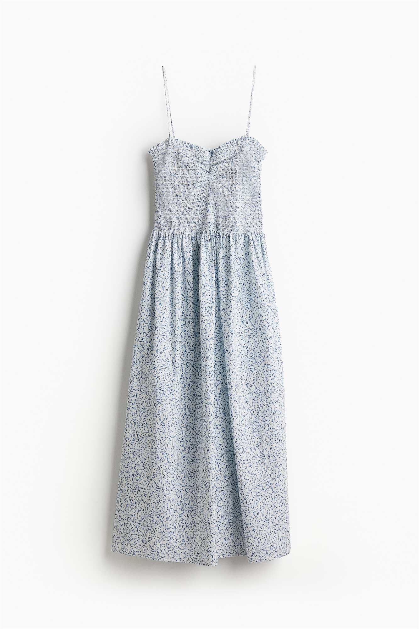 Платье длиной до колена из хлопкового полотна со съемными регулируемыми бретелями-спагетти и лифом с отделкой из плавок, вырезом в форме сердца с отделкой из оборок и эластичным швом по центру бюста. Присборенный шов на талии и расклешенная юбка. Без подкладки.