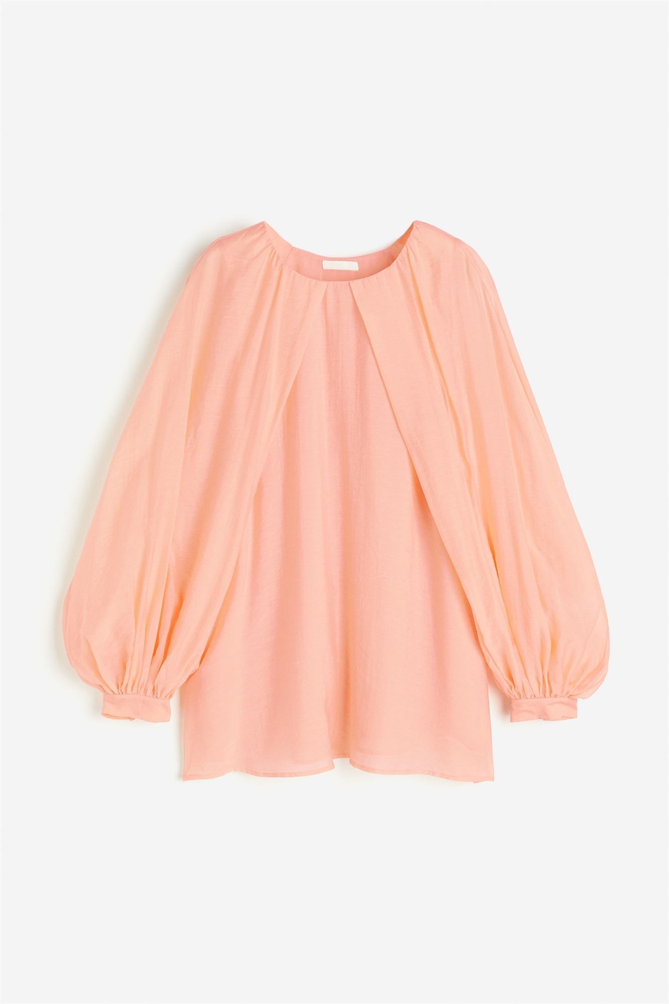 Слегка удлиненная блузка с воздушным плетением из смеси лиоцелла. Свободный крой с круглым вырезом в сборку, объемные рукава-баллоны, перекрещивающиеся сзади, и узкие манжеты с пуговицей. Частично на подкладке.