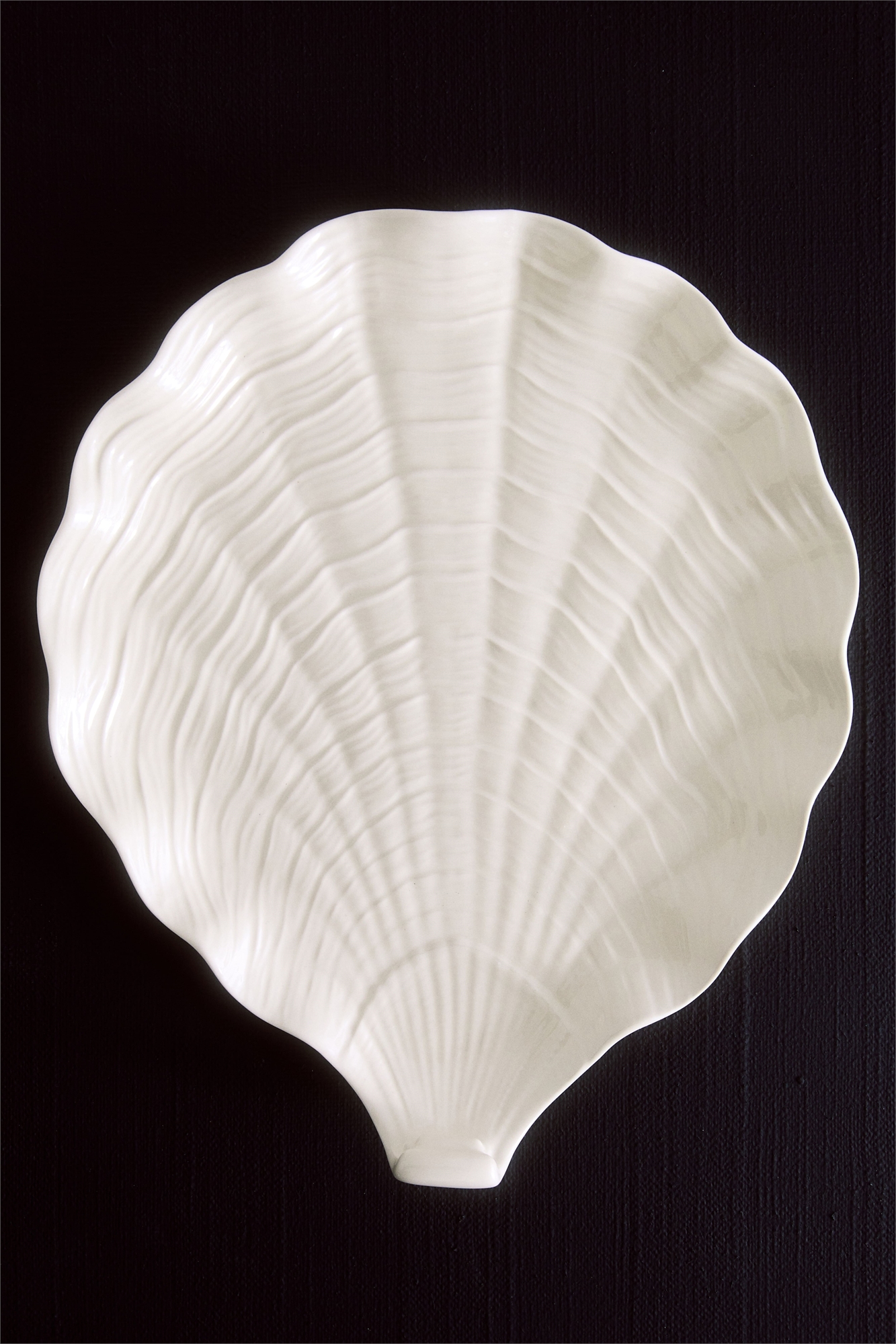 Сервировочная тарелка из глазурованного керамогранита в форме ракушки с фактурным колодцем. Высота 4 см. Ширина 33 см. Длина 38 см.