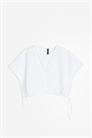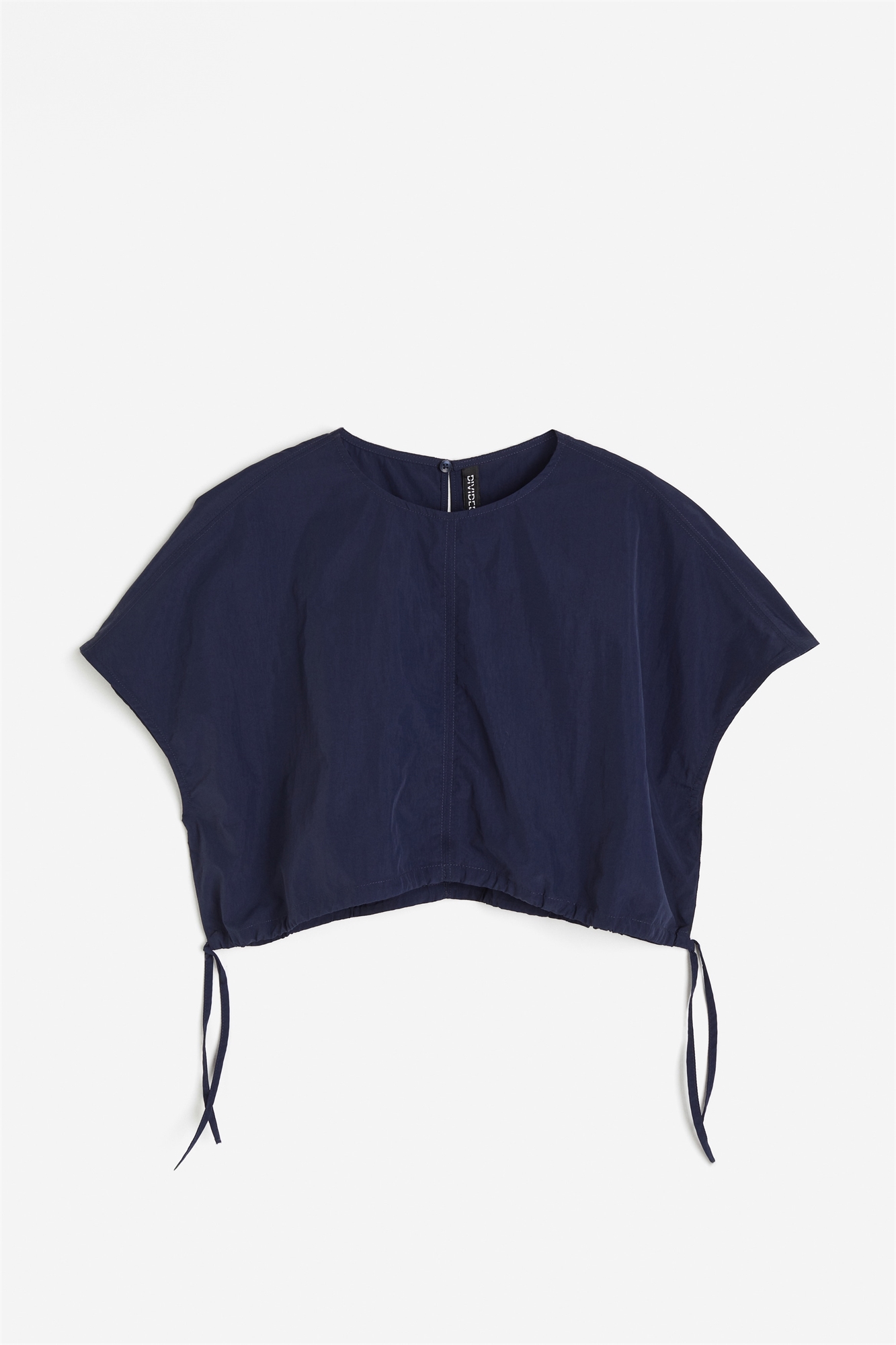 Короткая, свободная нейлоновая рубашка с круглым вырезом и маленькой петлей для застегивания на потайную пуговицу у затылка. Рукава-капельки и шнурок на подоле с боковыми завязками.