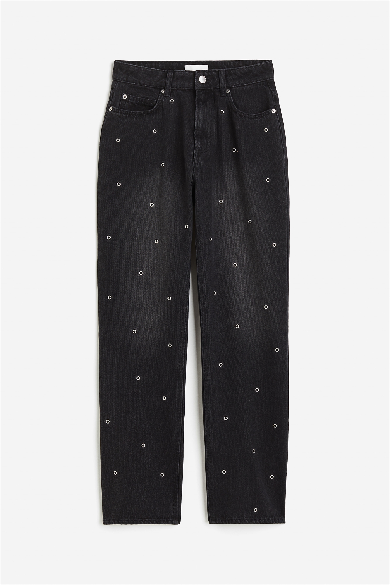 Джинсы с 5 карманами из жесткого хлопкового денима, который сначала кажется упругим, но затем смягчается и ослабевает при носке. Прямые джинсы с обычной посадкой от талии до бедер и более свободным, прямым кроем от бедер до подола. Высокая талия с ширинкой на молнии и пуговице. Удлиненная длина, созданная для того, чтобы ниспадать по ноге с эффектом укладки. По всей длине украшены декоративными металлическими люверсами.