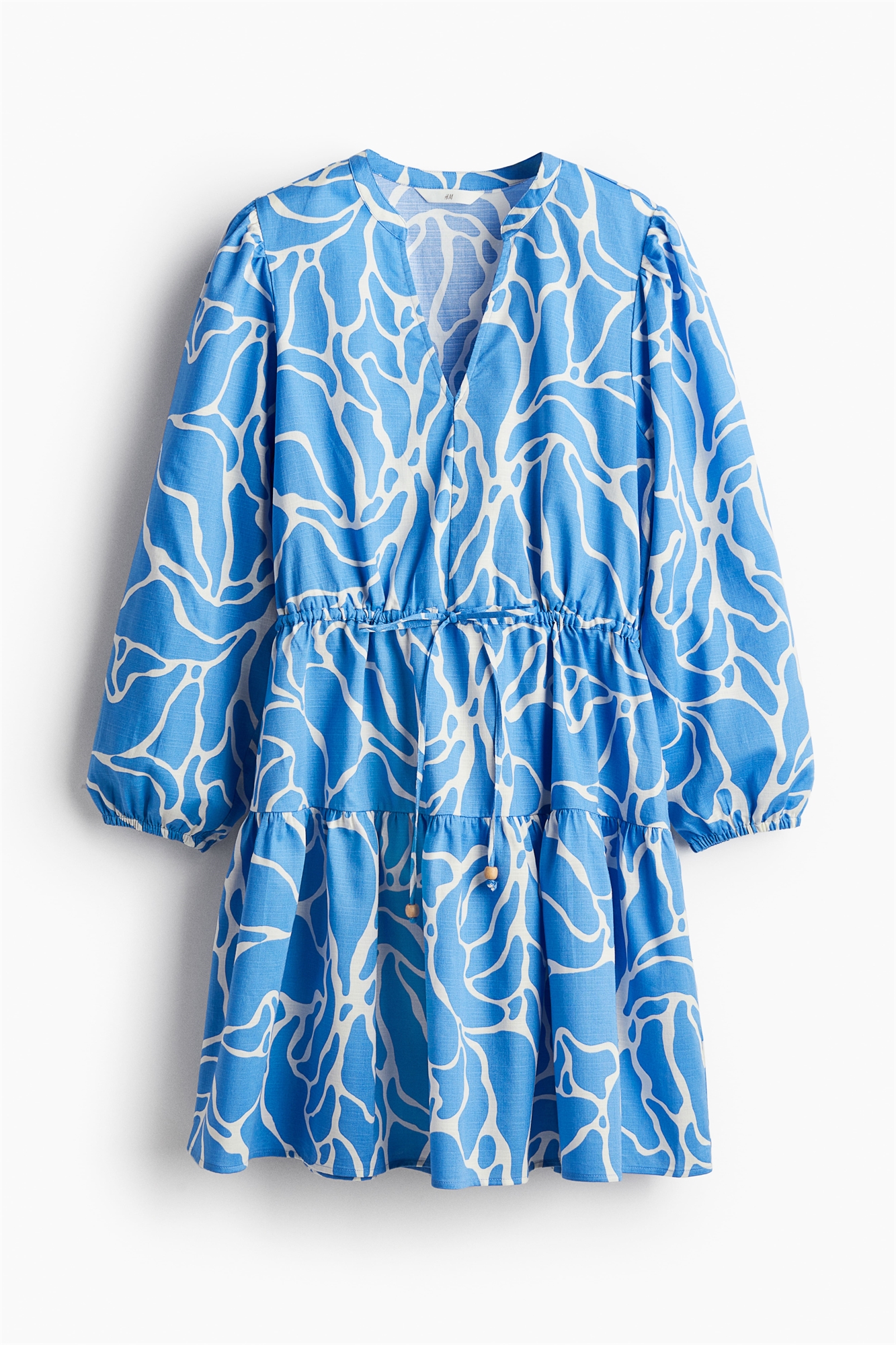 Короткое платье из тканого материала с воротником-бантом и V-образной проймой спереди. Длинные рукава-баллоны с узкой резинкой на манжетах. Узкий шнурок на талии с бусинами на концах и сборчатым швом над подолом для придания дополнительного объема. Без подкладки.