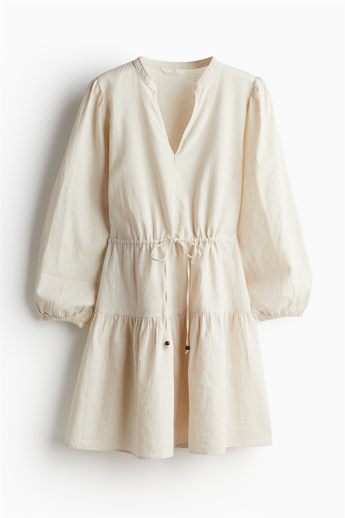 Короткое платье из тканого материала с воротником-бантом и V-образной проймой спереди. Длинные рукава-баллоны с узкой резинкой на манжетах. Узкий шнурок на талии с бусинами на концах и сборчатым швом над подолом для придания дополнительного объема. Без подкладки.