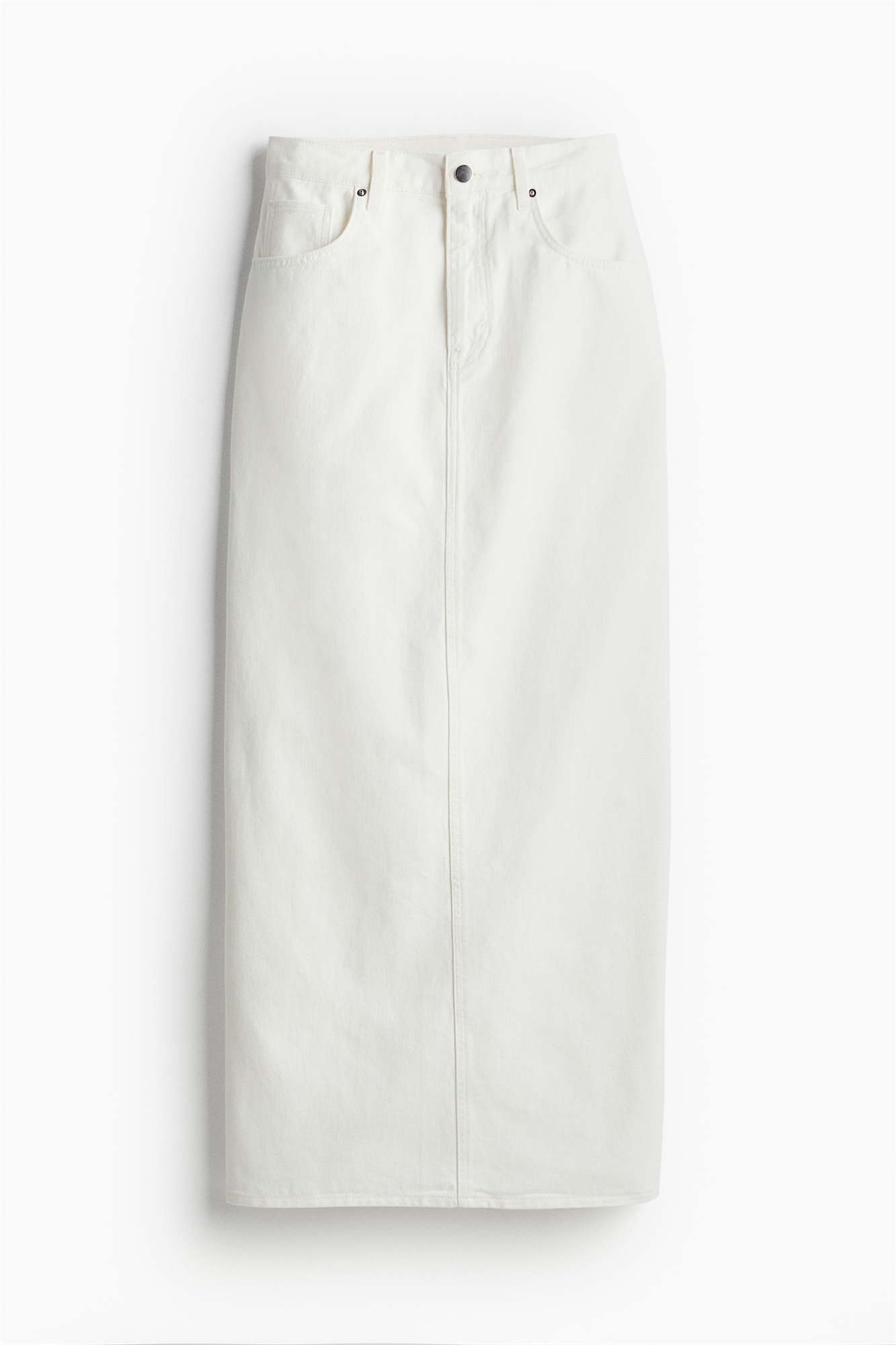 Длинная юбка из денима с 5 карманами, застежкой на молнию и пуговицу и высоким разрезом сзади.