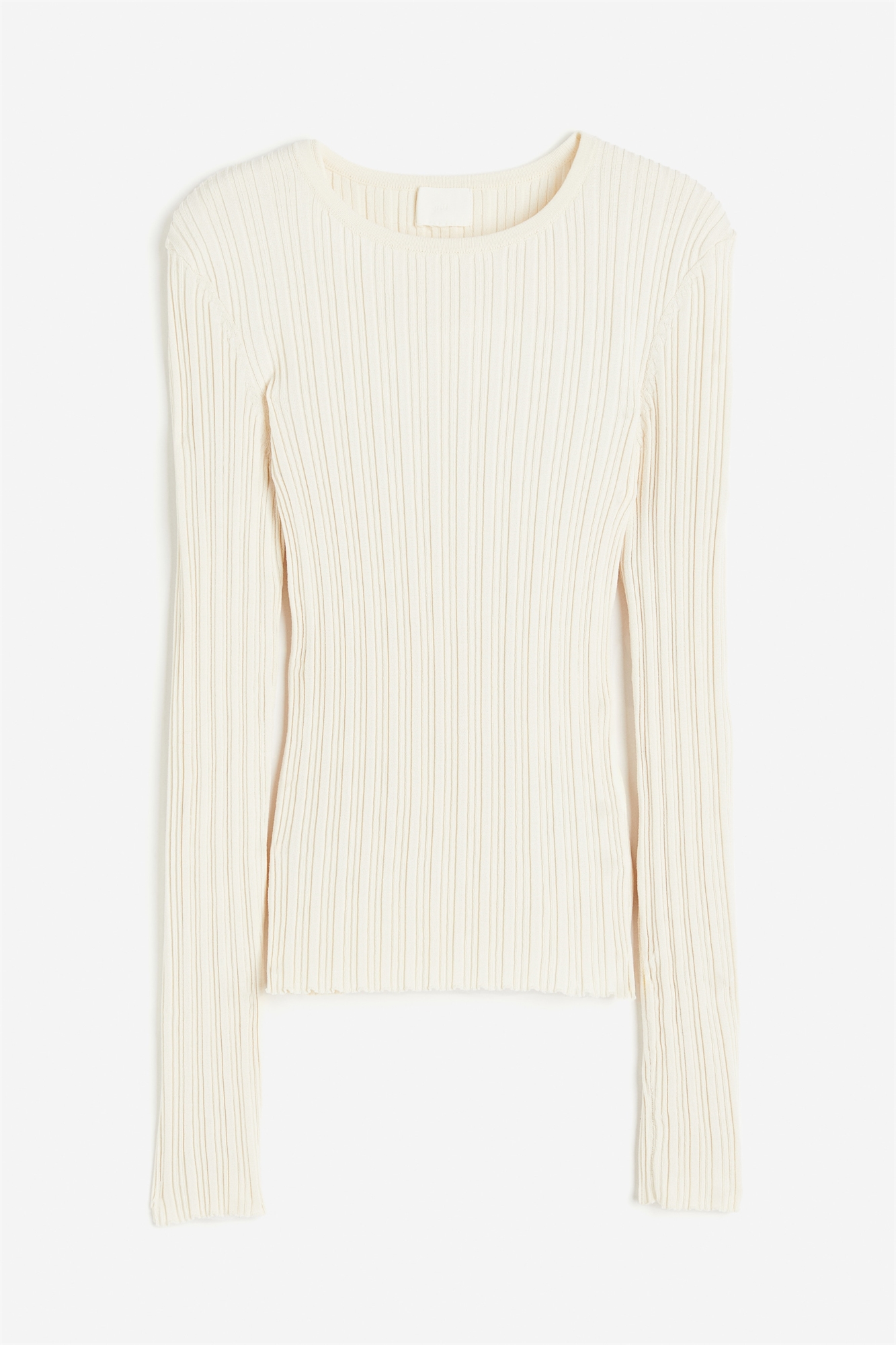Облегающий топ из тонкого трикотажа в рубчик с круглым вырезом, длинными рукавами и необработанными краями на манжетах и подоле.