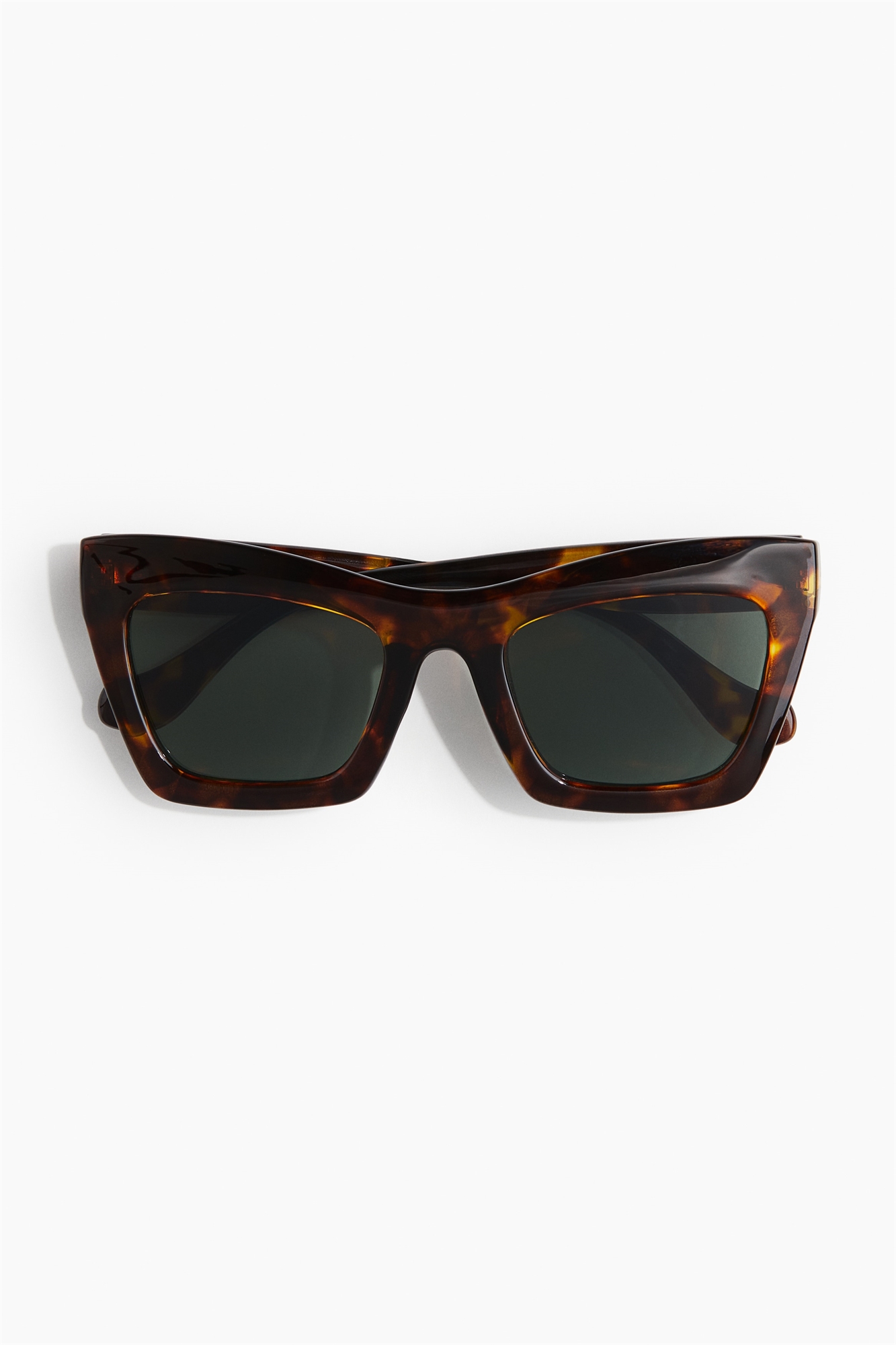 Солнцезащитные очки "кошачий глаз" с оправой и боковыми дужками из пластика. Тонированные пластиковые линзы с защитой от ультрафиолета.