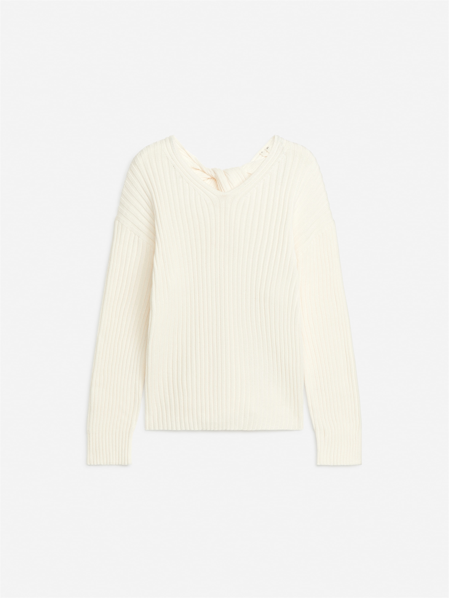 Джемпер из трикотажного хлопка с перекрученной деталью на спине. Мягкий V-образный вырез. Расслабленный крой.