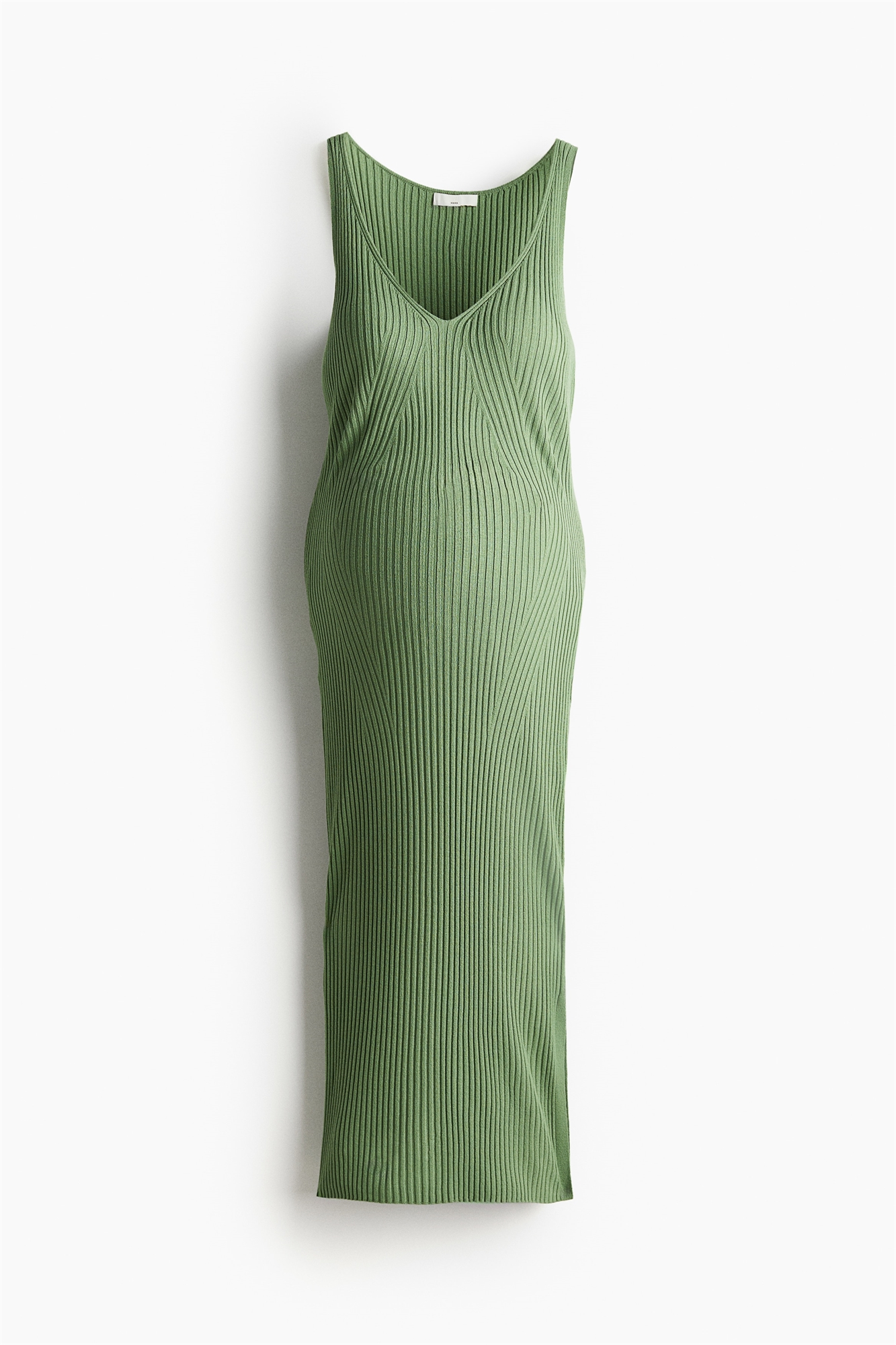 Приталенное платье без рукавов длиной до колен из мягкого трикотажа в рубчик с глубоким V-образным вырезом и цельнокроеным разрезом спереди. Прямой подол с разрезом с одной стороны.