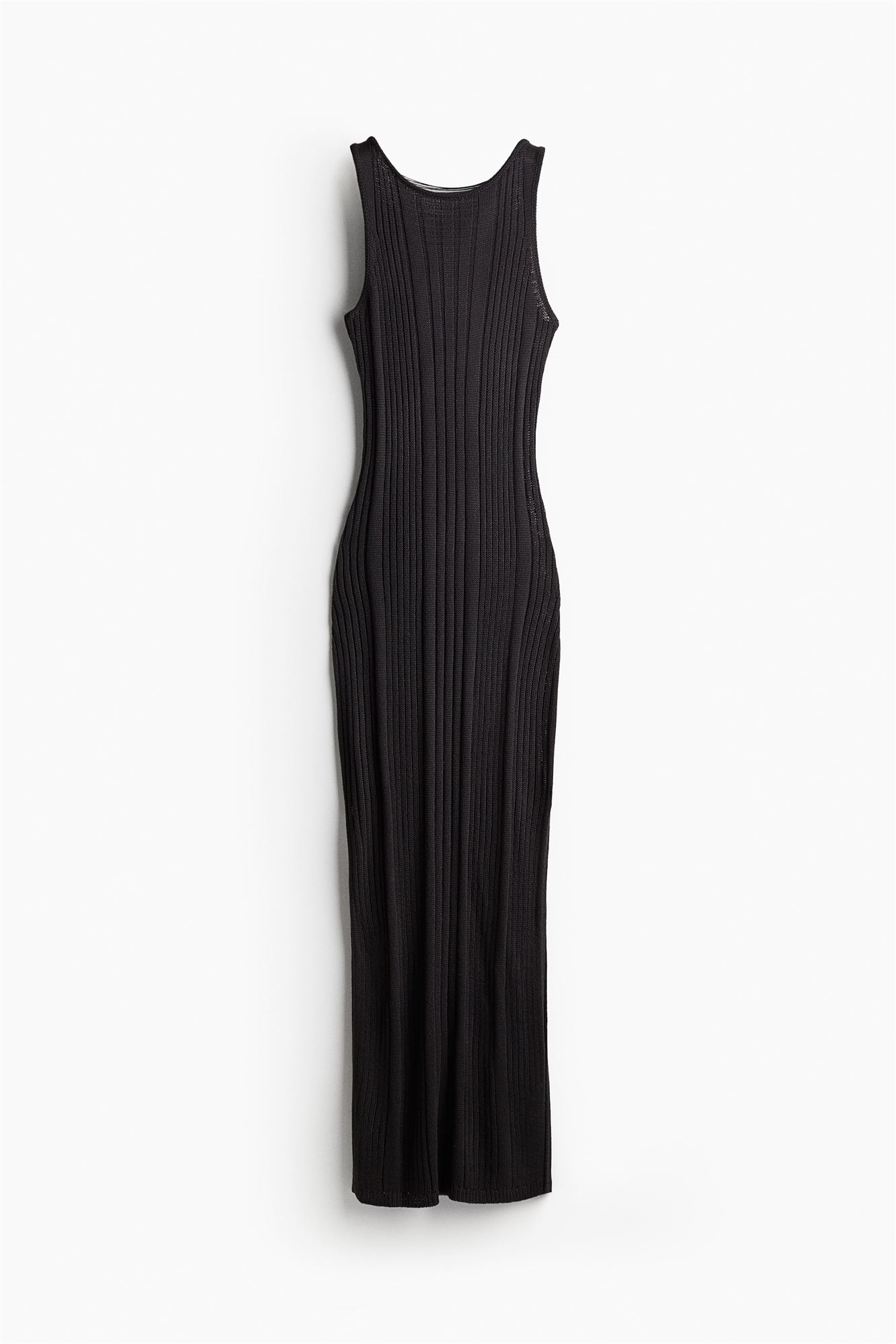 Длинное приталенное платье без рукавов из мягкого трикотажа в рубчик с круглым вырезом и V-образным разрезом с горизонтальной бахромой на спине. Прямой подол с высоким разрезом с каждой стороны.