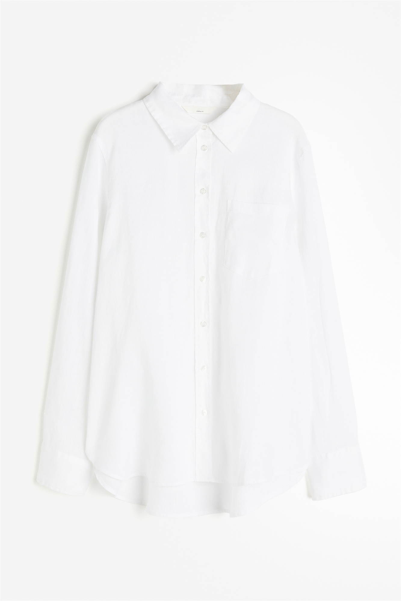 Рубашка из воздушного льна с воротником, пуговицами спереди и двухслойным ярмом сзади. Слегка спущенные плечи, длинные рукава с манжетами на пуговицах, накладной нагрудный карман и мягко закругленный подол.