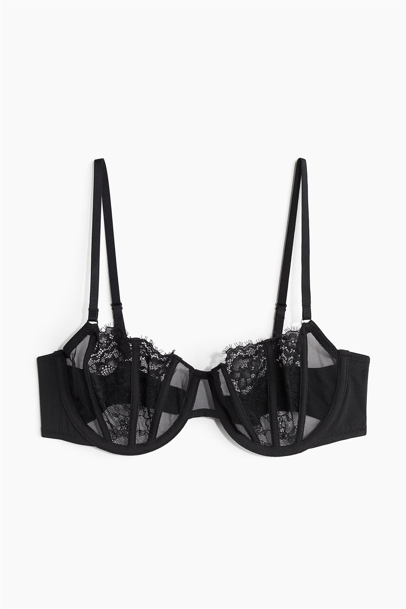 Бюстгальтер-балконет из кружева и сетки с чашечками без подкладки, которые придают бюсту естественную форму и обеспечивают легкую поддержку. Регулируемые бретели и застежка на крючки и глазки сзади.
