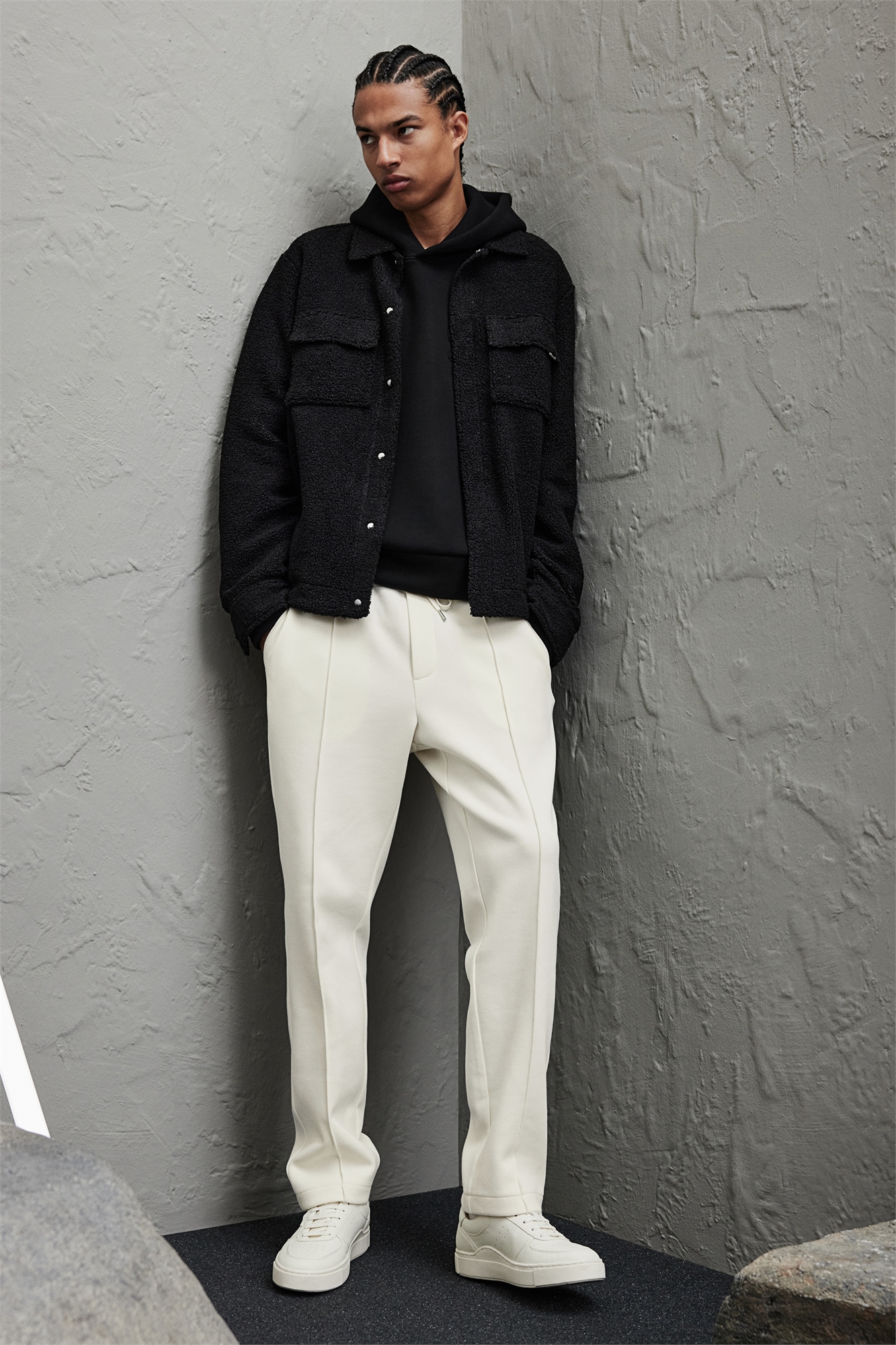 Приталенные джоггеры из тканого материала с утяжкой на талии, фальшивой ширинкой, боковыми карманами и накладным задним карманом. Пришитые складки спереди. Зауженный крой, облегающий контуры тела и создающий приталенный силуэт.