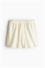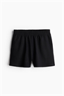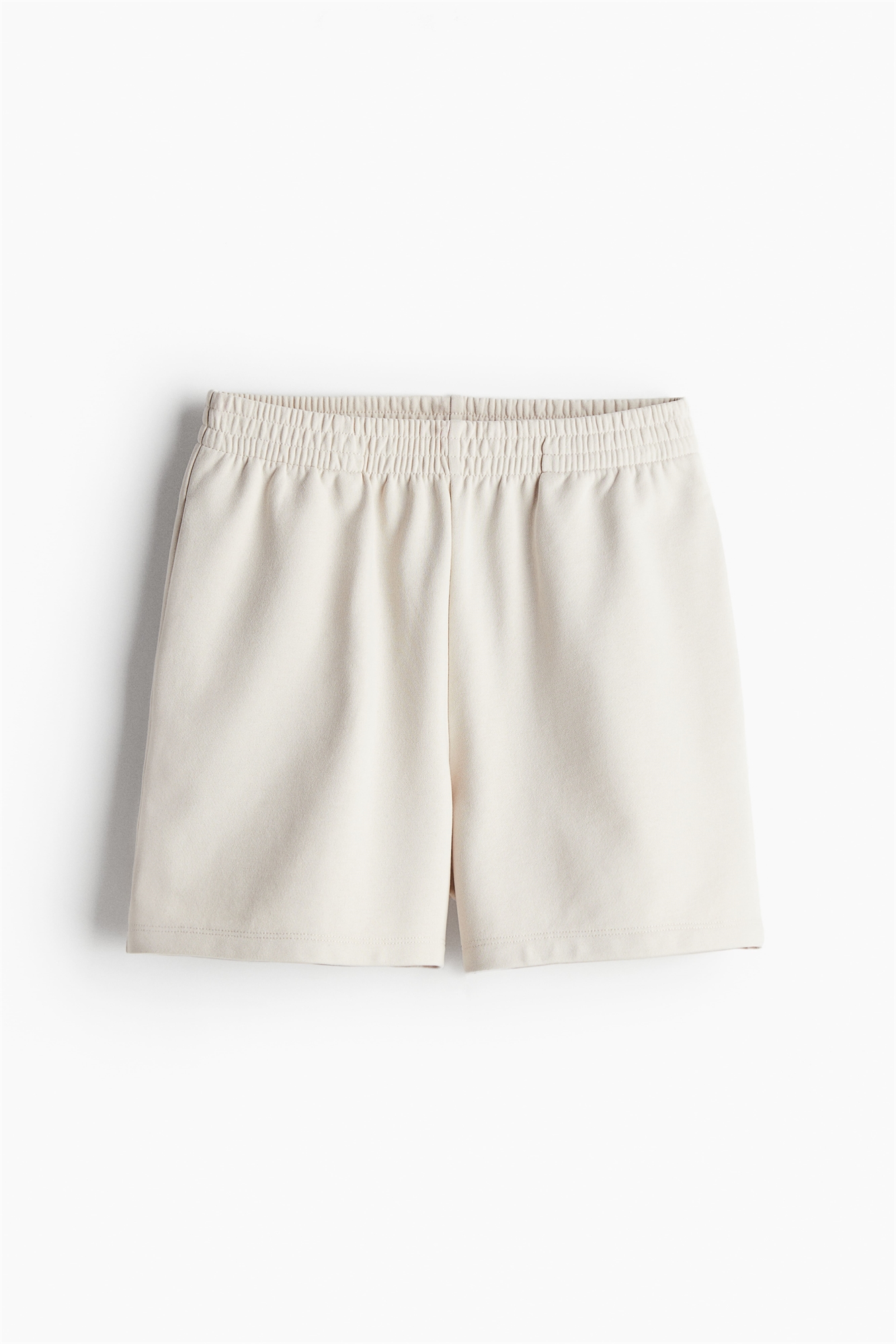 Шорты из толстоватой ткани с эластичной планкой на талии и незаметными карманами в боковых швах.