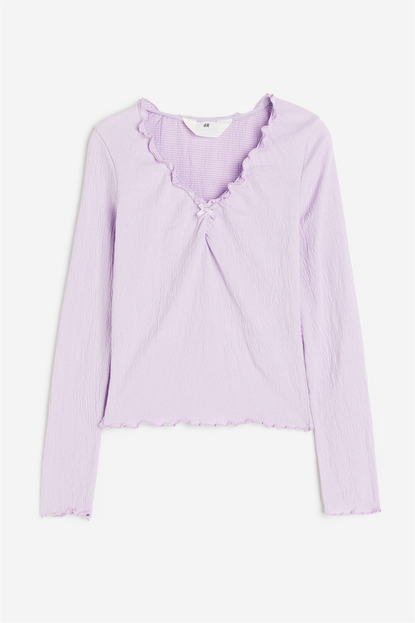 Топ с длинными рукавами из мятого трикотажа с V-образным вырезом, декоративным бантом спереди и оверлоком по краям.