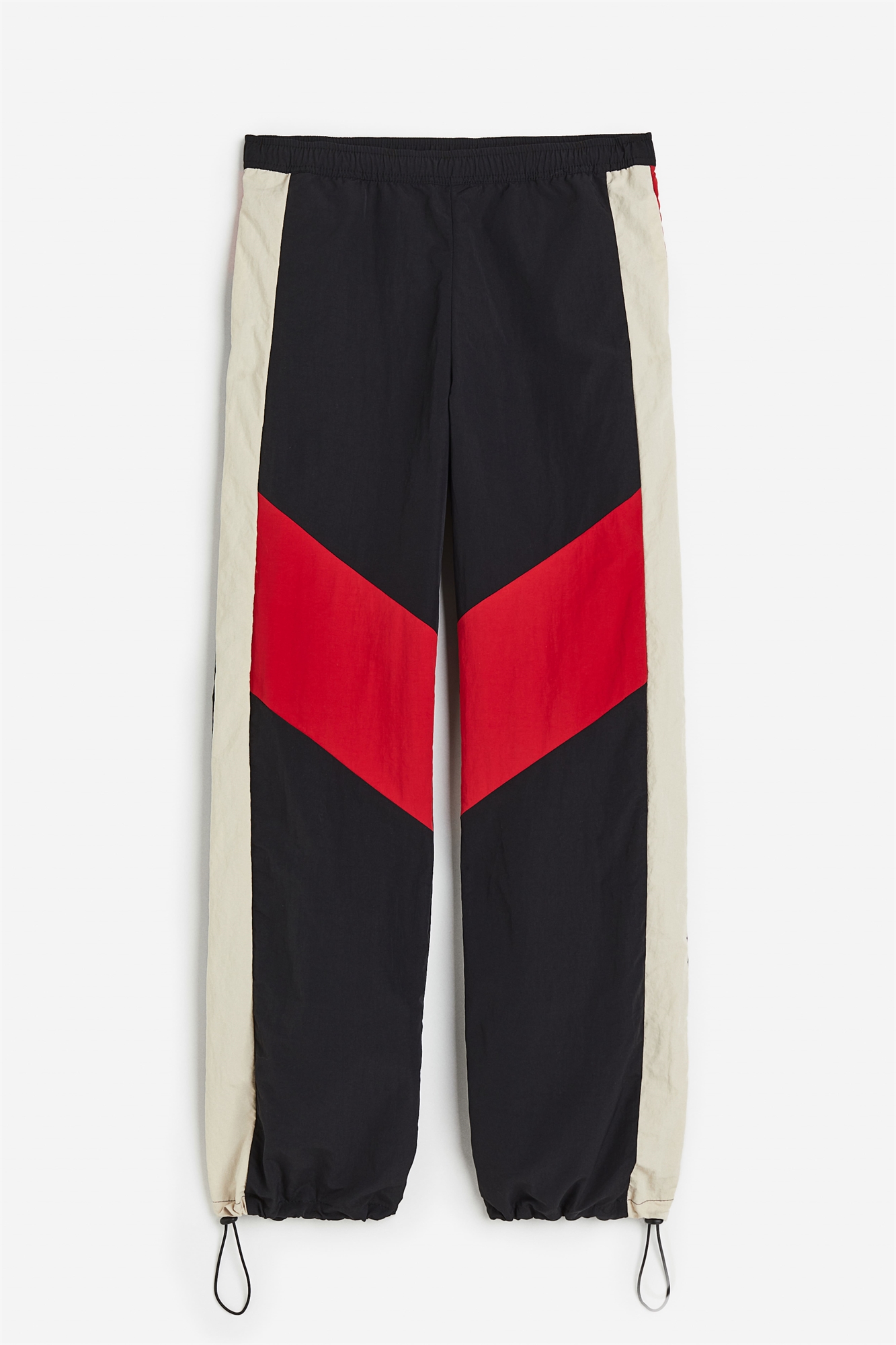 Свободные спортивные брюки из нейлона с эластичной резинкой на талии, незаметными боковыми карманами, прямыми ногами и эластичным шнурком со стопором на подоле.