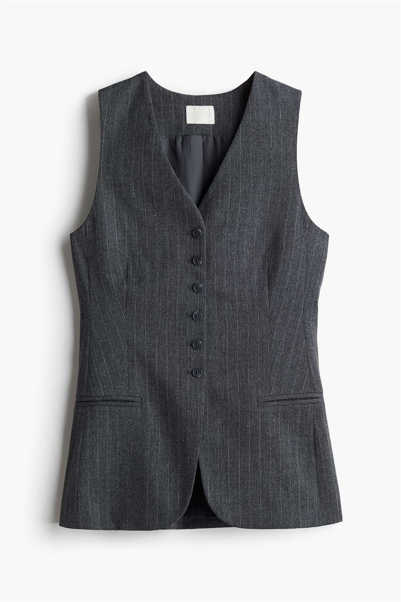 Длинный приталенный жилет из тканого материала, изготовленного из смеси вискозы и лиоцелла. V-образный вырез, пуговицы спереди и прорезные передние карманы. На подкладке.