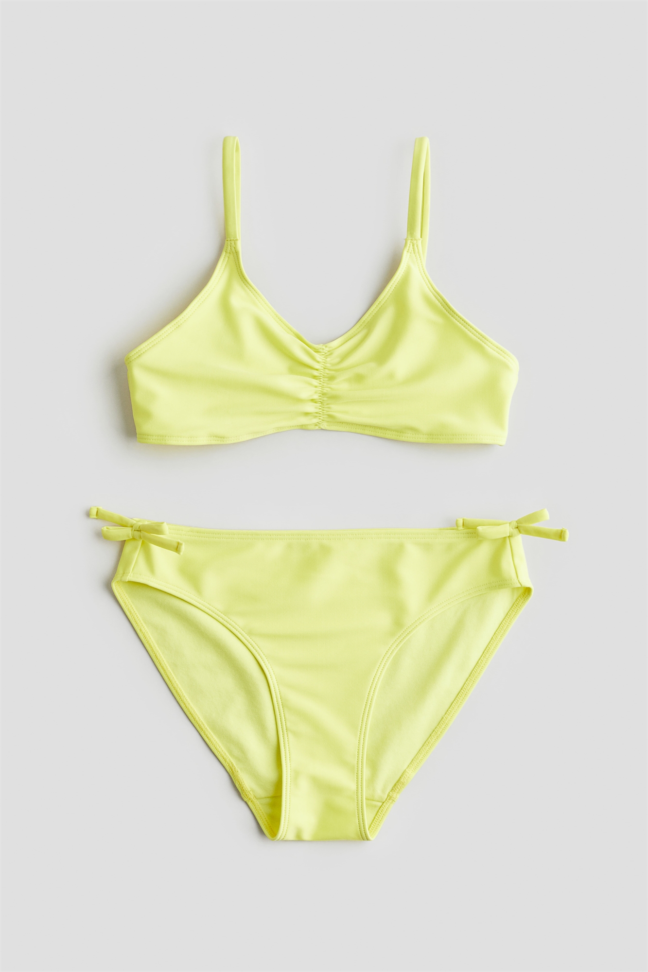Полностью закрытое бикини на подкладке с топом и подходящими к нему нижними частями. Топ с узкими регулируемыми бретелями, V-образным вырезом, сборчатым швом спереди и пластиковой застежкой сзади. Низ с декоративным бантиком на талии с каждой стороны.