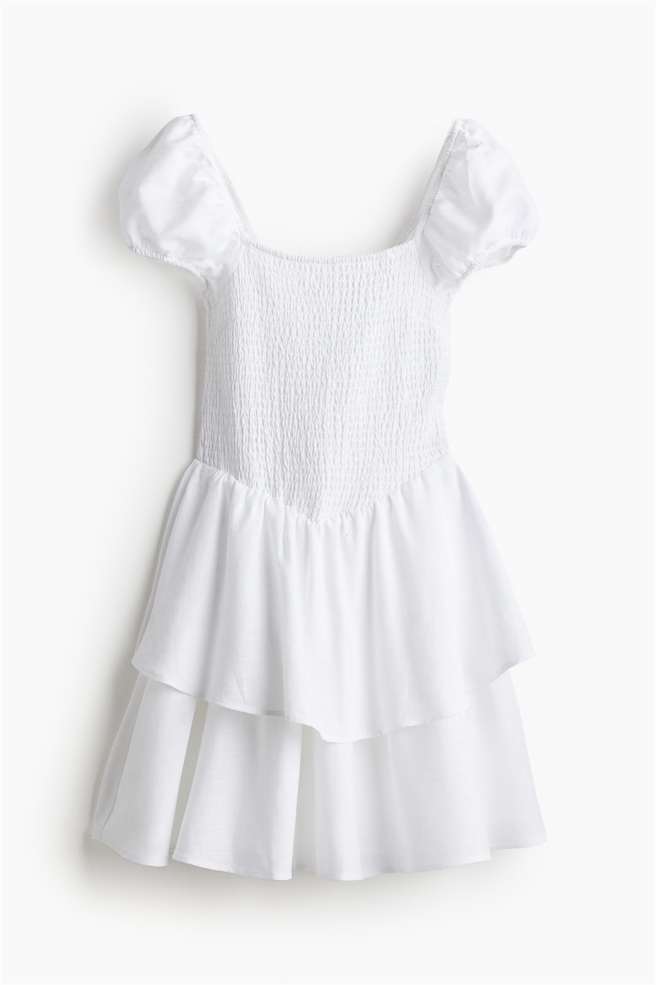 Короткое платье воздушного переплетения из смеси льна и вискозы. Квадратный вырез, короткие пышные рукава и узкая резинка по вырезу, на плечах, на манжетах и талии. Облегающий лиф с платочной вставкой и расклешенная юбка с двумя ярусами. Юбка на подкладке.
