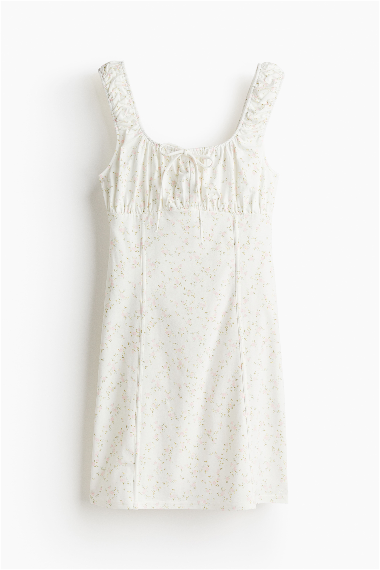 Облегающее мини-платье из мягкого джерси с широкими эластичными бретелями и квадратным вырезом с декоративным бантом спереди. Сборчатый шов под бюстом, корсетные швы спереди и сзади и слегка расклешенный подол.