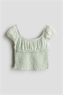 Топ в клетку с глубоким круглым вырезом, короткими пышными рукавами и отделкой оборками на талии. Узкая эластичная резинка вокруг выреза и на манжетах.