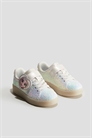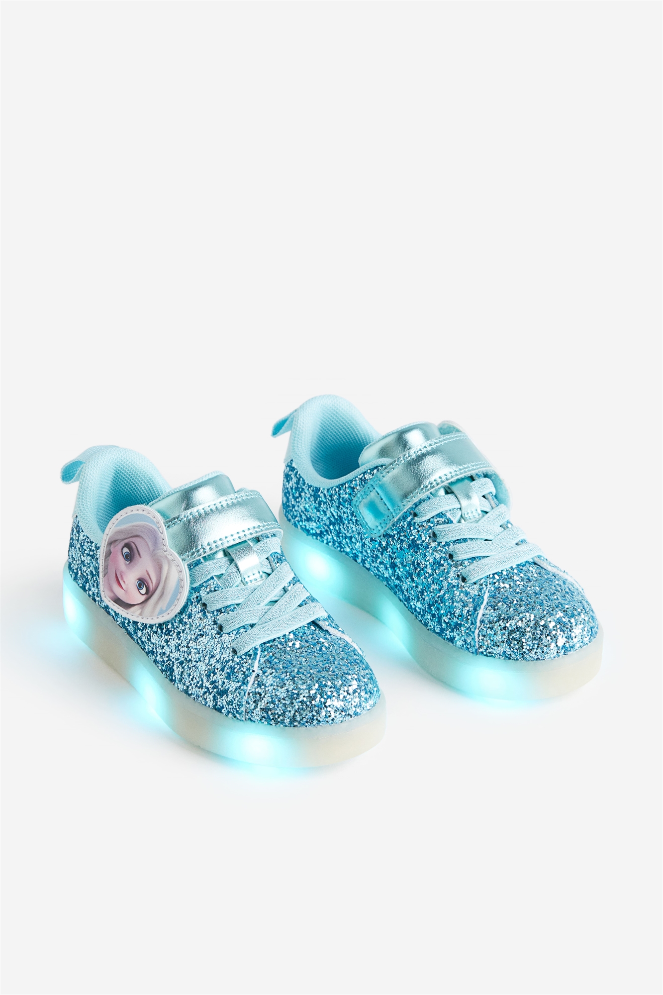 Блестящие кроссовки с мягкой подкладкой, застежкой на крючок и петлей в верхней части, эластичной шнуровкой спереди и петлей из гросгрейн сзади. Подкладка из пике и стелька из технической пены Cellfit™ для дополнительного комфорта. Подошвы с мигающими светодиодными лампочками, активируемыми при движении. Высота подошвы 3 см.