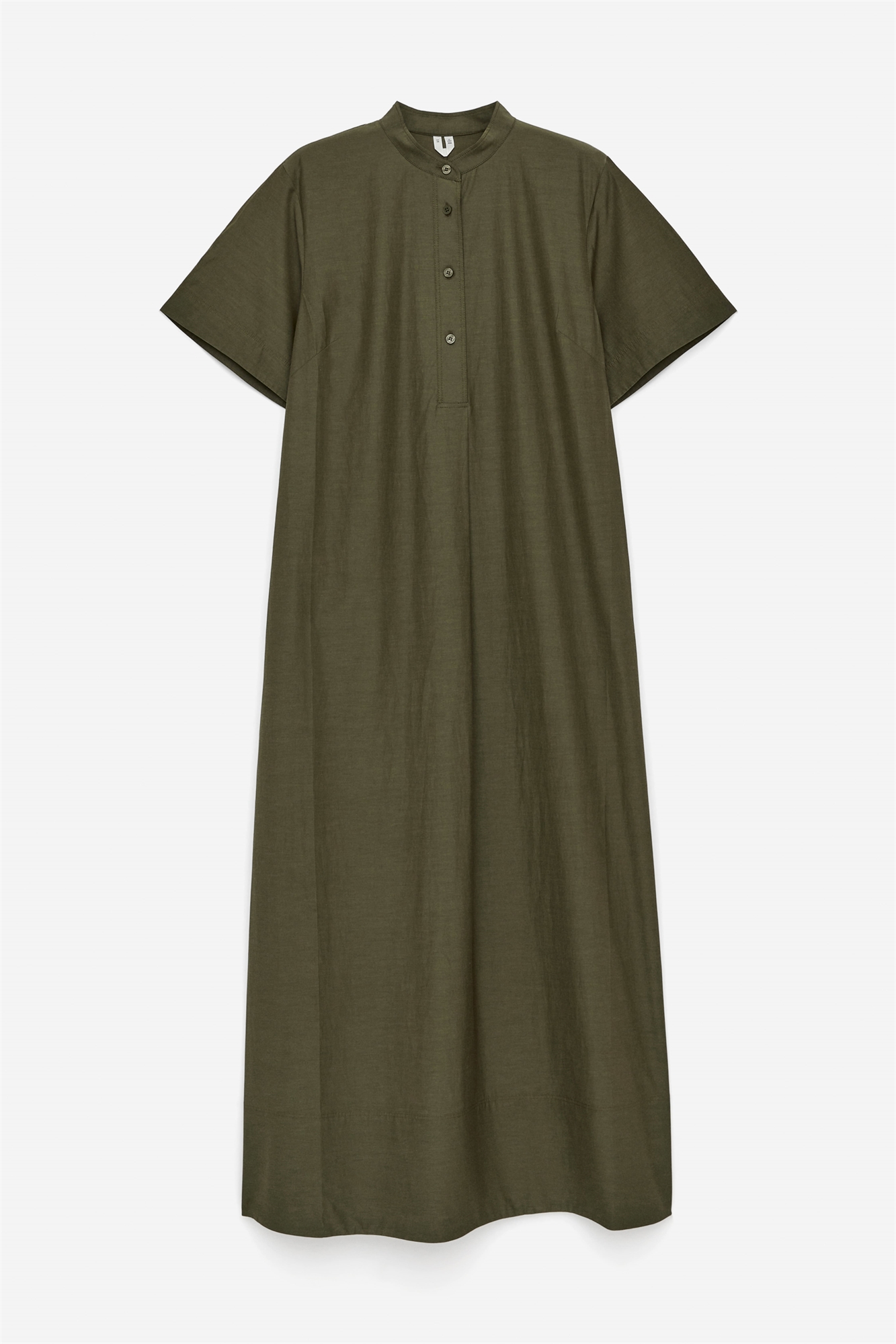 Длинное платье из блестящего переплетения купро и хлопка. Воротник-стойка, потайные карманы в боковых швах и одинарная складка под полузастежкой на пуговицах.