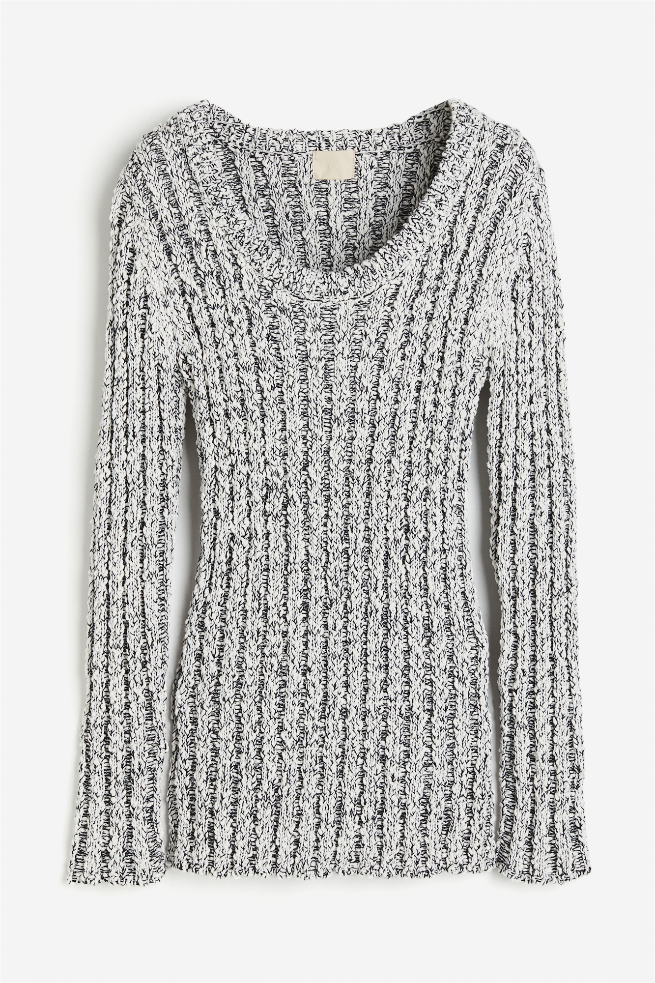 Слегка удлиненный джемпер из мягкого трикотажа в рубчик с глубоким круглым вырезом и длинными рукавами.