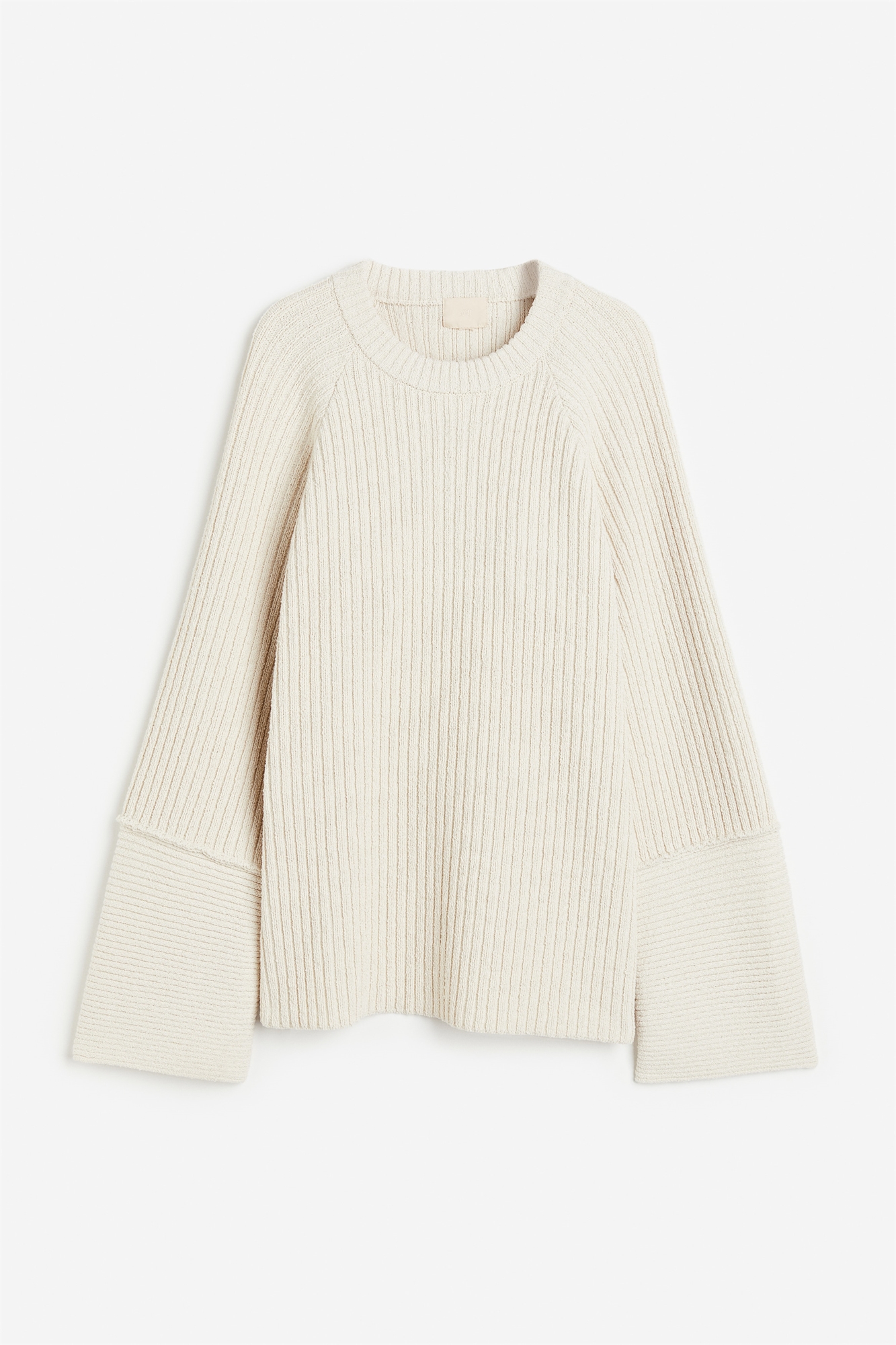 Джемпер оверсайз из мягкого ребристого трикотажа с круглым вырезом и длинными рукавами реглан с широкими манжетами. Открытая спина с горизонтальным ремешком с D-кольцами для индивидуальной стильной посадки.