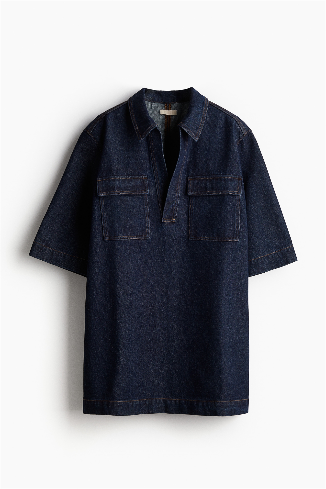 Мини-платье из прочного хлопкового денима с воротником и V-образным вырезом. Свободный крой. Слегка спущенные плечи, широкие рукава длиной до локтя и нагрудные карманы с клапанами.