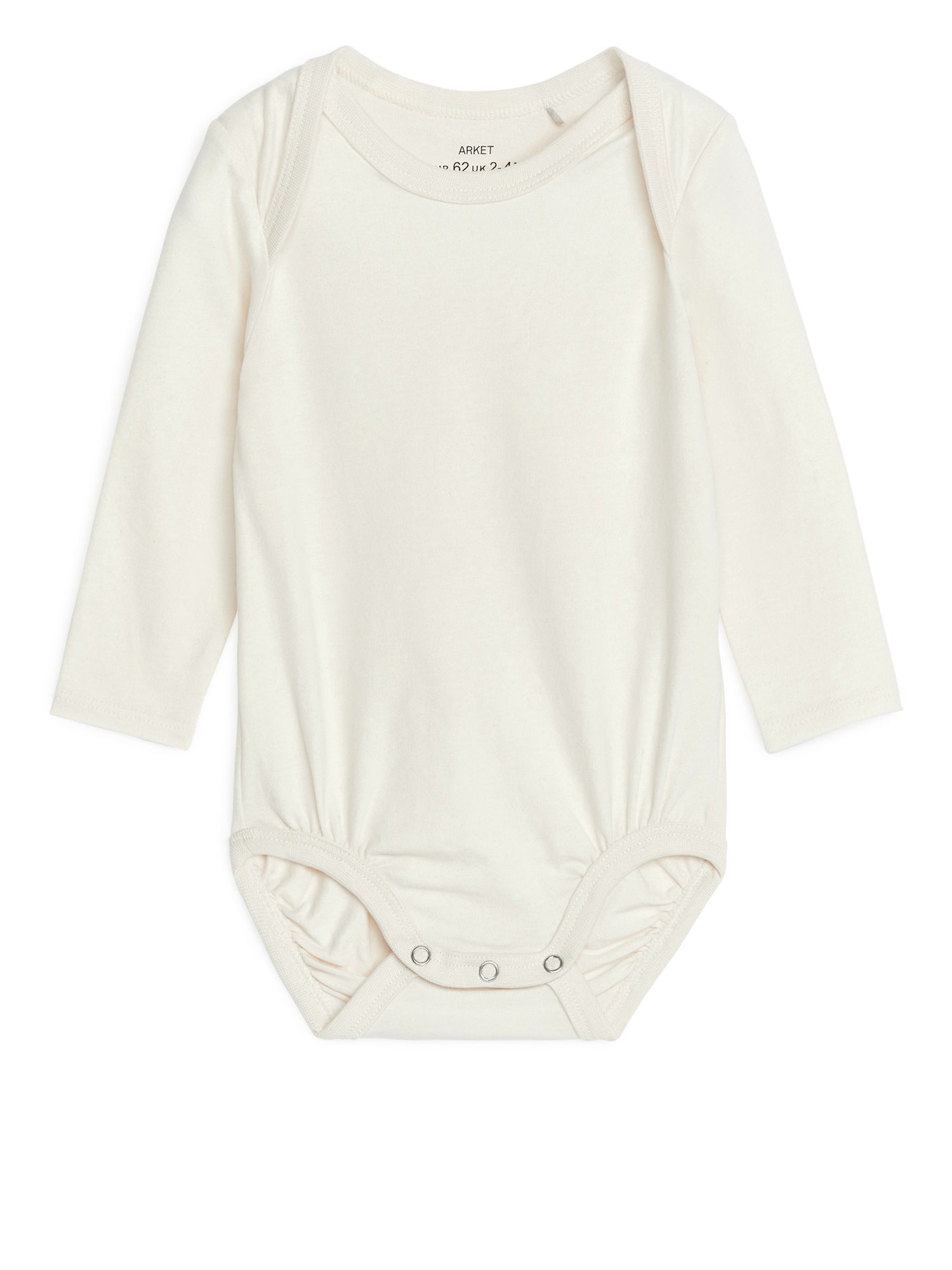 Боди-комбинезон для новорожденного. Изготовлен из очень мягкого, эластичного хлопкового трикотажа с матовой поверхностью, напоминающей персик. Вырез горловины в виде конверта и застежки-кнопки в промежности для удобства одевания.
