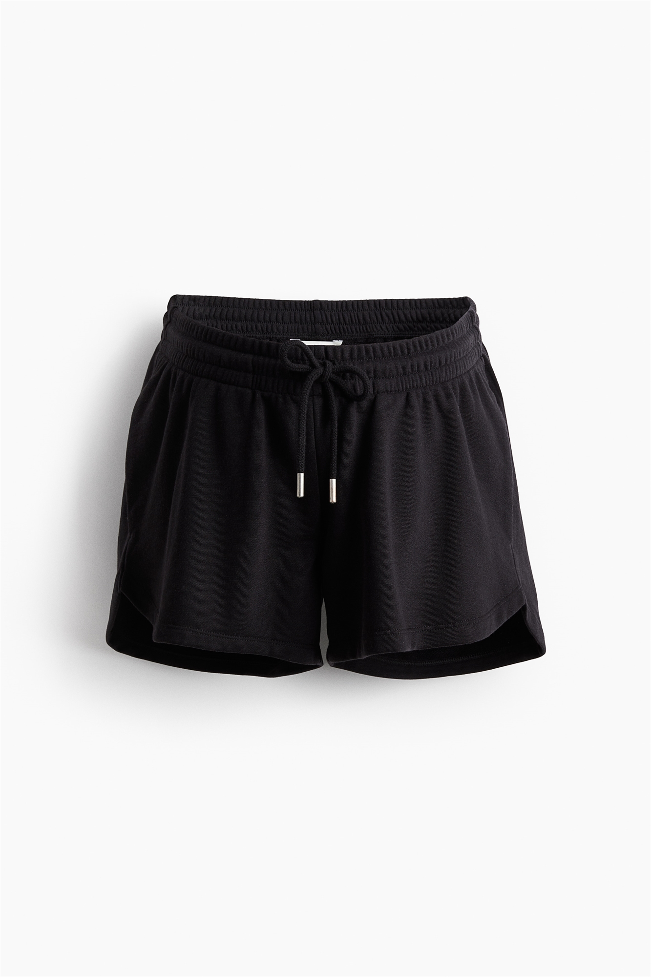 Шорты из легкой толстоватой ткани с эластичным утягивающим поясом, незаметными карманами в боковых швах и аккуратно загнутыми краями.