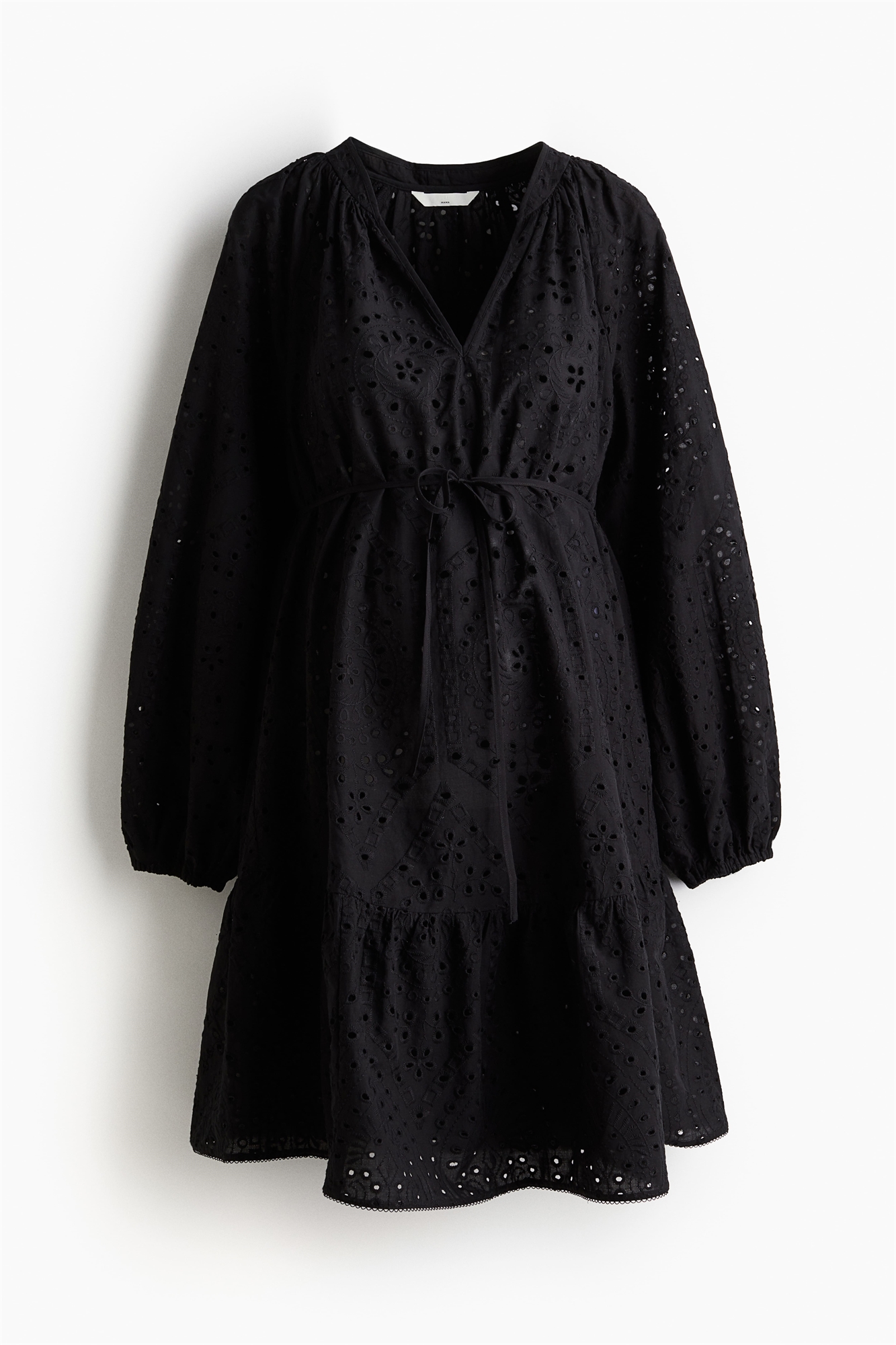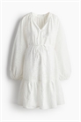 Короткое платье-туника из воздушного хлопка broderie anglaise. Небольшой воротник со складками и V-образная пройма спереди. Длинные рукава-баллон покроя реглан с узкими эластичными манжетами и узким съемным поясом-завязкой под бюстом. Без подкладки.